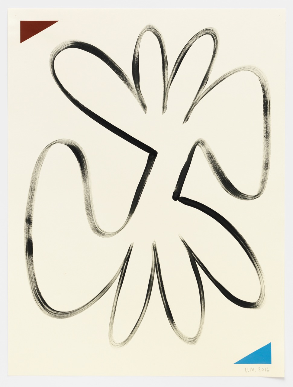 In Brat (2016), the hyper, eight-legged or -petaled shape moves just like a “brat,” with a mind of its own, not tethered to the polite corners, one marked in blue and one in dark red. Other works in acrylic and papier collé on paper, like Façade and The Smoker (both 2016), are faces and architecture. They remind us of the stylized, metonymic manner in which a face could be signaled in abstraction’s early days, or a right angle made more impressive, more meaningful, in a building. And, like those early, communally oriented avant-gardes, they too tread that line between the modular and the ornamented, the systematic and the individual.