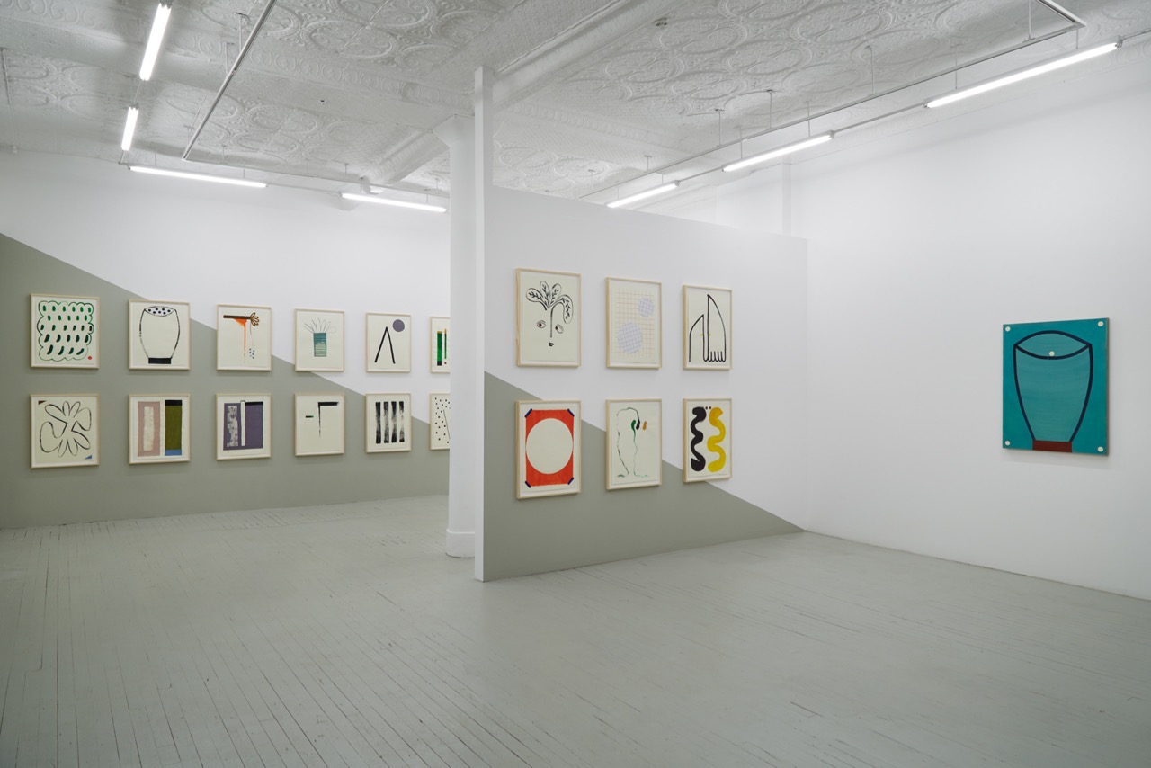 At Callicoon, Müller’s paintings are as dexterous as they have ever been. Most in the show are on paper; a few are enamel, and even fewer are on canvas. They remind us of vases, faces, flirtations. Her earlier paintings on vitreous enamel on steel—a medium she has made her own for the past decade—made ambiguous associations to sexed or unsexed body parts (is that V-shape a knee, is that hump a haunch?). Over time, and thanks in part to a new color palette, these enamel paintings have begun to look more “abstract,” like the kinds of line-and-color experiments that populated communally oriented modernist workshops such as the Bauhaus and the Wiener Werkstätte. But a more striking departure from her earlier work is to be found in the more figurative drawings in acrylic paint and papier collé on paper. There, we confront a figure on a ground, expressed always in the uninterrupted line of paint, its viscous, mono-colored brush-drag virtuosically clean. But this virtuosity is friendly, wants you to come inside; it is not a mere display.