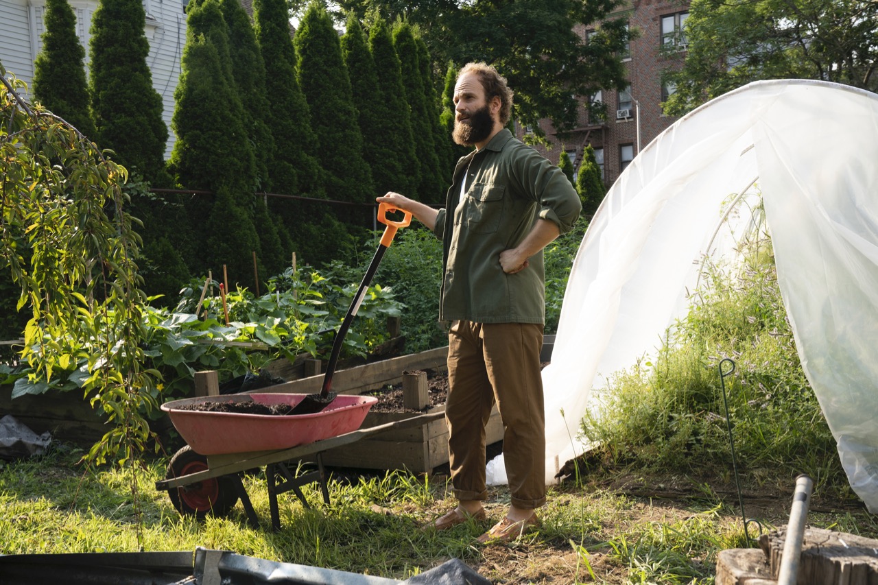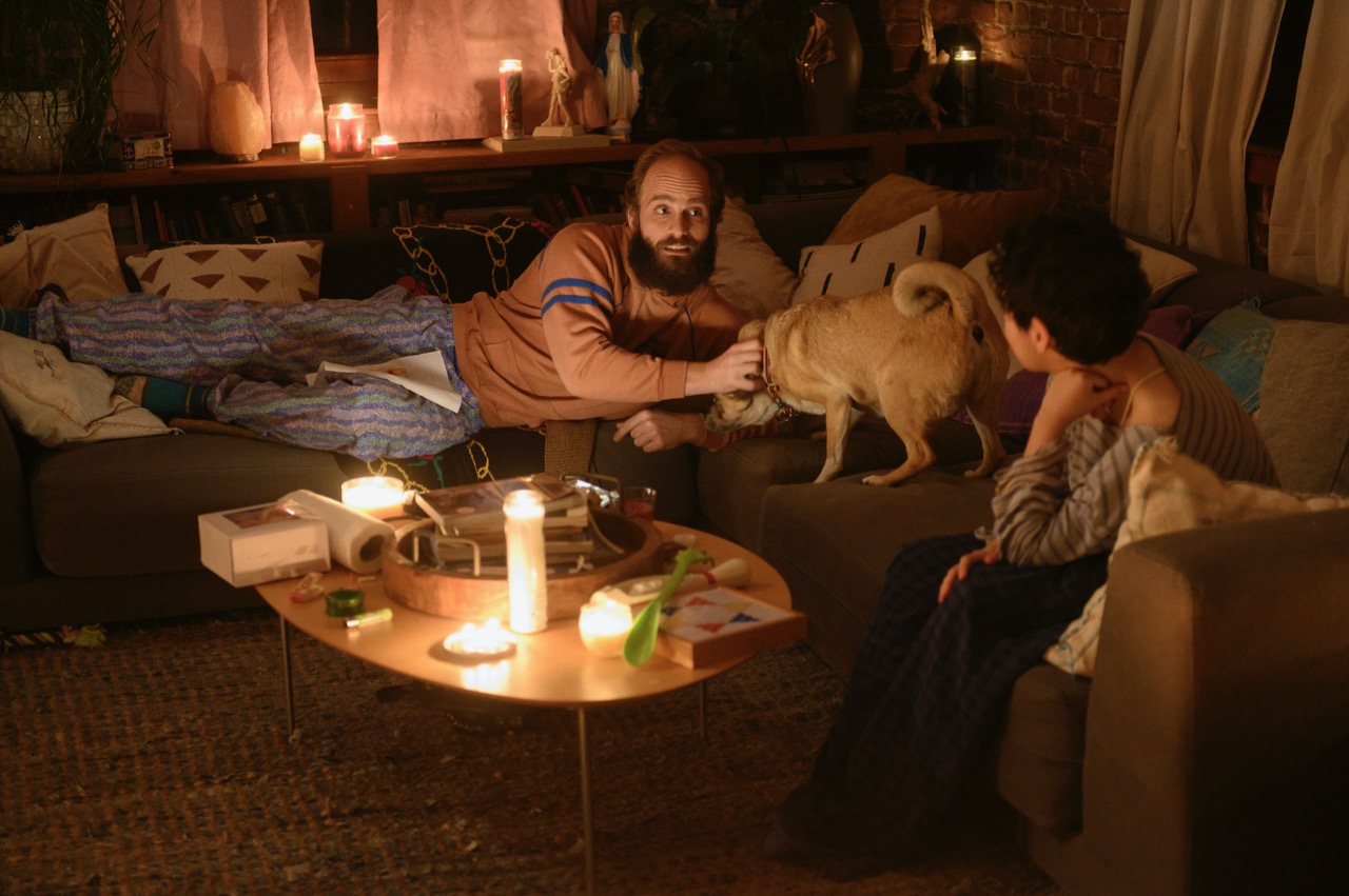 Such stochastic socializing and its side effects have long powered the narrative engines of High Maintenance. At the center of every episode are the peregrinations of the Guy, a nameless weed dealer who provides a connecting element between the myriad types composing his far-flung customer network—he’s played by Ben Sinclair, cocreator of the show with Katja Blichfeld. With his crooked grin, framed by an echt-Brooklyn weirdo-beard, the Guy could be the Spirit of Weed itself, a Bacchus of the bong rip. He bikes his case of goodies into the apartments of a menagerie of urban types: bodybuilders, lesbian moms, a depressed veterinarian, an indoor nudist, a cross-dressing husband; comedians, dancers, writers; an agoraphobe, an asexual, an ex-Hasid. The series is concerned not so much with marijuana itself as with the wide range of everyday city dwellers who crave its relaxing qualities. Each of the Guy’s customers serves as the viewer’s envoy into yet another self-contained micro-society, variously conglomerated around professions, passions, or family ties. The majority of characters appear for only one episode; a few move through different episodes not so much in storytelling arcs as Mandelbrotian loop-the-loops.