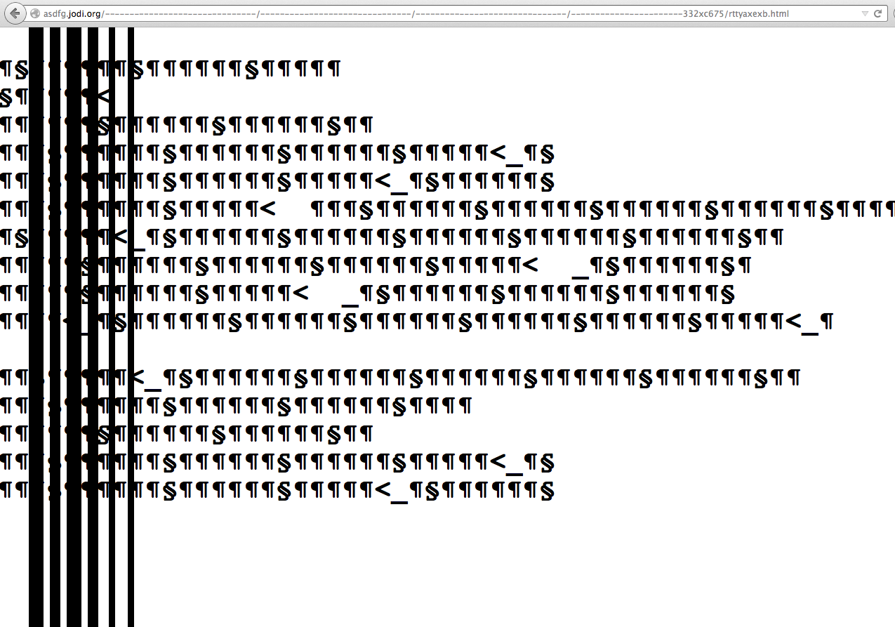 Subsequent JODI projects embody this clash between the page and its underlying code in websites that appear to struggle against their own construction, exemplified in their piece http://asdfg.jodi.org (1999), whose subdomain references the left-hand layout of a US computer keyboard. Clicking on the URL loads a never-ending series of silent pages filled with overlapping, strobing patterns of black-and-white text. These abstractions jitter rhythmically up and down and side-to-side in response to the automated movements of each page’s scrollbars; each page stays on screen for about twenty seconds before redirecting to another sibling page, seeming to give some agency to the browser itself as the URL moves from path to path. If JODI’s H-bomb joke plays with the legacy of conceptual art, in that it stresses the centrality of an a priori generative text for its meaning, the spasmodic pages that reside on the asdfg subdomain evoke instead the optical-perceptual processes of experimental film and analog video art, in which an individual work’s aesthetic force relies on its existence as a temporal event, an experience happening in real time for the viewer; the containment of the page’s moving images within the proscenium-like browser frame subtly encourages today’s Netflix-trained web-surfer to lean back into binge-watch mode.