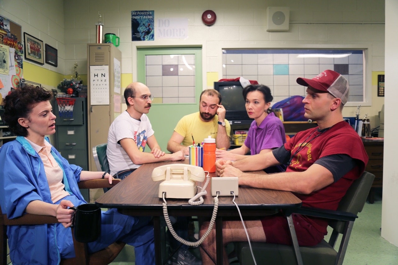 Ohio, not surprisingly, is where the play takes place. This production forces you to bear witness to a series of faculty meetings at Garrison High School, in the fictional town of Garrison, during the 1988–89 school year. Six teachers—Sandra, David, Rod, Ken, Julie, and Brenda (Stephanie Wright Thompson, Michael Dalto, Joe Curnutte, Marc Bovino, and Amy Staats, respectively)—have joined this year’s committee to organize the annual telethon to raise $1,000 for a pair of sports scholarships dedicated to the memory of a track team member who died in a car crash nine years before. This year, the chair of the committee, Brenda, has had an accident that keeps her from attending in person. During the majority of the meetings, her voice buzzes in through a speakerphone.
