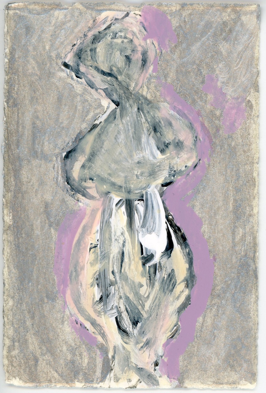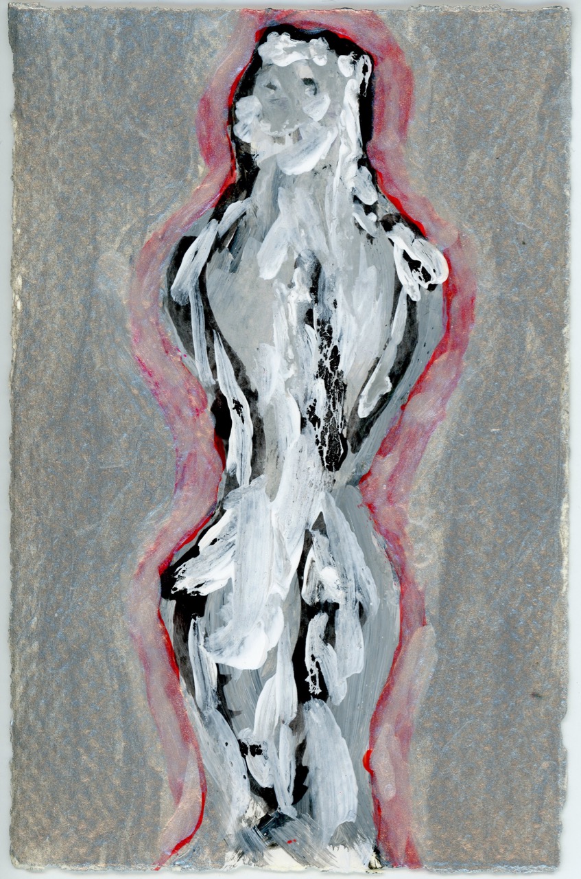 The hourglass figures in the frames look as if Davis might have painted over photographs of these cinematic icons, but photographs are not included in the materials lists. And quite the materials lists they are! Davis has painted her constructions on watercolor paper with nail varnish, pomade, glycerin, hair spray, mascara, eyebrow pencil, Jean Naté perfume, and Afro Sheen hair conditioner. I’ll admit that I tried to smell them through their frames, and sadly could not even get a faint whiff of Aqua Net. But what fragrances they must have!