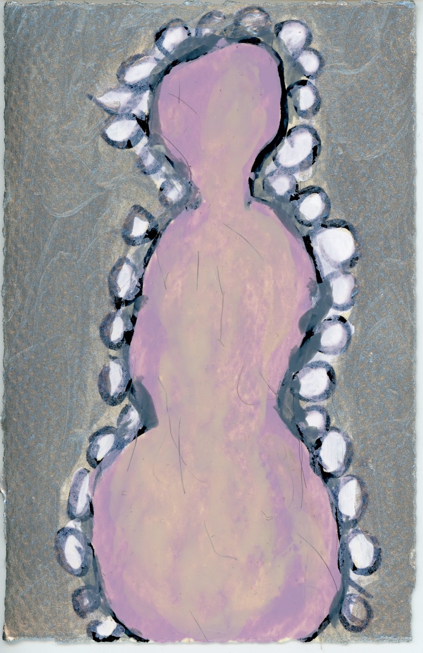 By abstracting the images of these celebrated figures—turning them into silhouettes dotted and striped with cosmetics—Davis renders them into something akin to fetishes or Venus figurines, invoking some ritual of queer ancestor worship. Is she doing a black queer parody of Louise Bourgeois? The installation itself, with a ceiling-mounted rectangular halo of fluorescent light shining on walls painted the drab tan of an archaeological exhibition at a decrepit museum, inspires a hushed connection with each of Davis’s goddesses. Made by another artist, these paintings might not so easily bridge ancient and modern iconography, nor would they seem quite as cheeky and possibly satirical, a poker-faced spoof of the feminist and queer Hollywood diva worship Davis presumably holds dear.