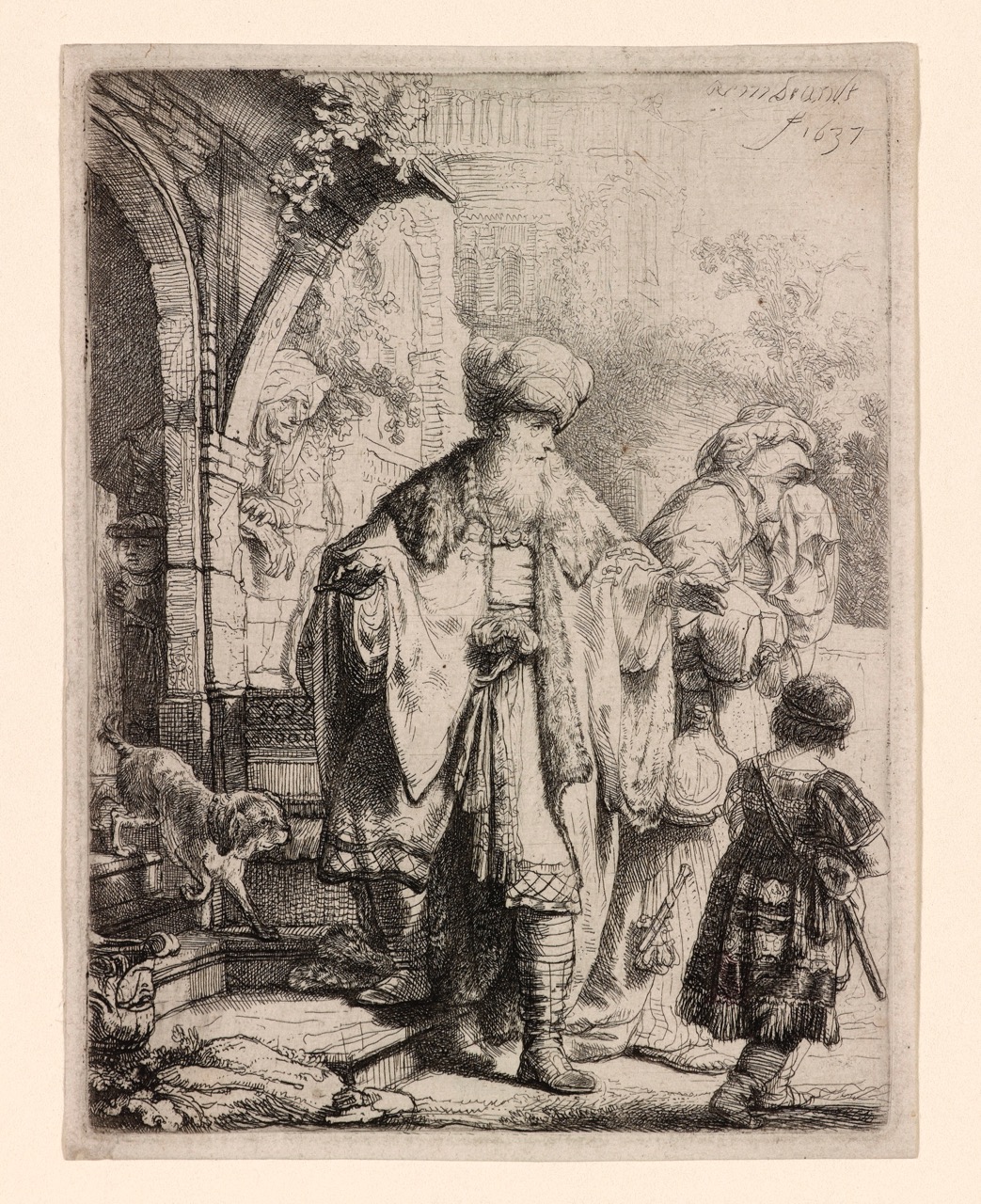 Rembrandt, Abraham Casting Out Hagar and Ishmael, 1637. Etching with touches of drypoint, only state, 4 ⅞ × 3 ¾ inches. Photo: Morgan Library & Museum.