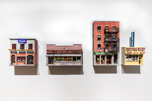 Nicholas Buffon, left to right: The Stonewall Inn, 2017; Katz’s Delicatessen, 2017; Odessa, 2016; Lower East Side Coffee Shop, 2016. Foam, glue, paper, paint. Courtesy the artist and Callicoon Fine Arts. Photo: Will Ragozzino / SocialShutterbug.com.