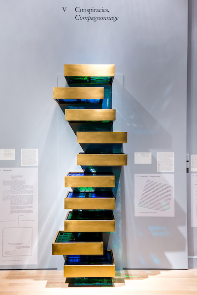 Benjamin, of course, wrote about the potential for appropriated elements to be ignited when brought into in new contexts, with the capacity to create what he called an “image” or “profane illumination.” In stark contrast with Goldsmith’s flat-affect experiments, Chilean Voluspa Jarpa’s citation/replication of Donald Judd’s iconic minimalist stacked boxes in What You See Is What It Is (2013) are far more in tune with Benjaminian ethics. For her installation under “Convolute V: Conspiracies, Compagnonnage,” Jarpa has placed into the rectangular prisms brightly colored sheets of plastic that reproduce declassified US government intelligence documents concerning its involvement in twelve Latin American countries during the Cold War, with so many redactions that the plastic sheets are full of holes and look like large, colored data punch cards. The effect is to transform Judd’s boxes into drawers of file cabinets with secret information that in their obscure, cipher-like way bear witness to the arrest of popular will and the murder of nameless thousands. (“The construction of history,” wrote Benjamin, “is consecrated to the memory of the nameless.”)