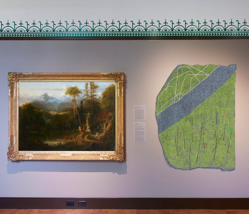 Native Prospects: Indigeneity and Landscape, installation view. Courtesy Thomas Cole National Historic Site. Photo: Peter Aaron. Pictured, left: Thomas Cole, Solitary Lake in New Hampshire, 1830. Oil on canvas. Right: Teresa Baker, Forest, 2019. Willow, yarn, spray paint, and buffalo sinew on AstroTurf, 69 × 52 inches. Forge Project Collection, traditional lands of the Moh-He-Con-Nuck.