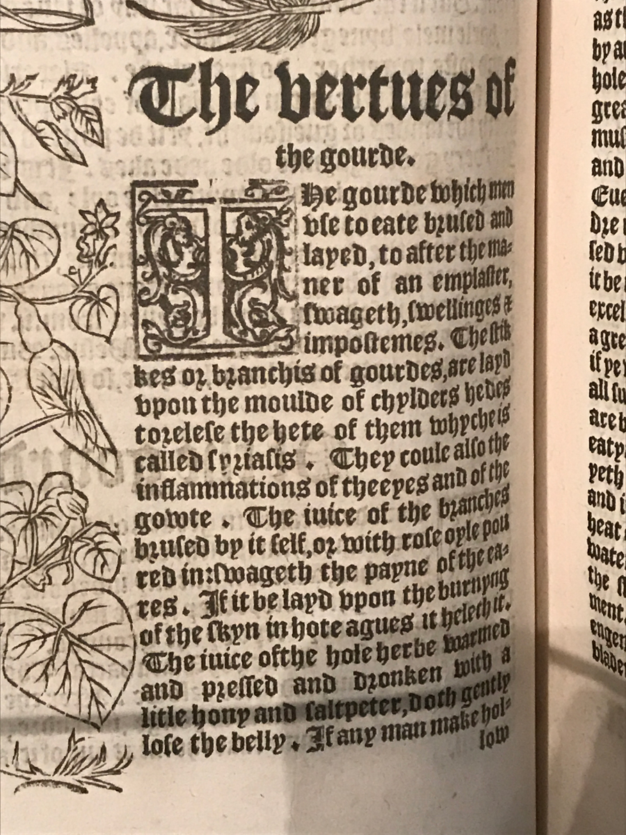 I come because I want to see what the books might tell me, only they are mute, hidden behind glass, with no translation offered for their Latin, German, and French texts. An illustration of bugloss, almost five hundred years old, glows on a touch screen. The flower is a “weed” that grows in waste places (and on my road). In 1597, John Gerard wrote of bugloss (though his The Herball is not here), that it is “of force and vertue to drive away sorrow and pensiveness of the minde, and to comfort and strengthen the heart.” A recent study says that bugloss indeed does work as an antidepressant. One book, open to a detailed 1588 print, identifies lemon balm (also good for anxiety) by its Latin name, Melissa. Two of its flowers mysteriously levitate off the plant, like an alien abduction, but I cannot turn to “Pag. 99” as the image instructs. Trying to untangle “the Vertues of the gourde” in William Turner’s 1551 A New Herball, laid out inside one of the room’s vitrines, I manage to decipher: “They coule also the inflammations of the eyes and of the gowte.”