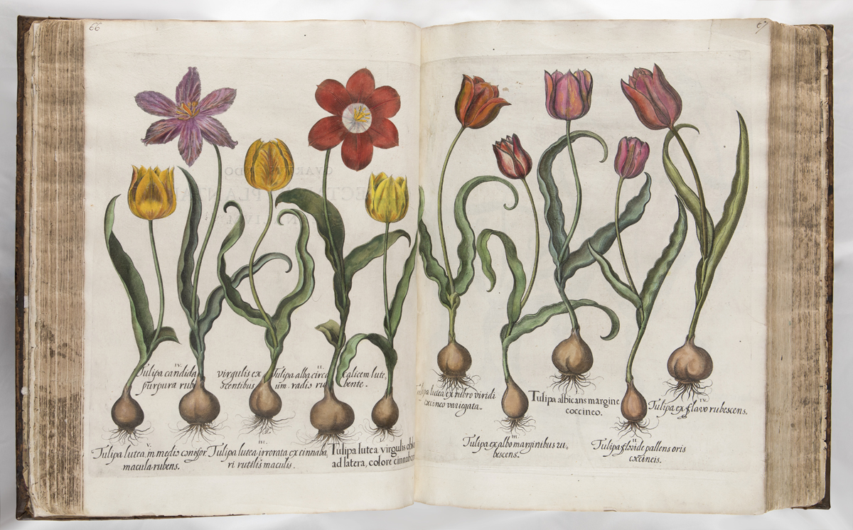 Then, there are the actual plants squashed and flattened into another book, called the Herbarium Vivum, meaning living, but oh so dead. Or, the life-size images of tulips spread across a centerfold—roots, bulbs, blooms and all—in the Hortus Eystettensis (Garden of Eichstätt). The flowers are new to Europe (also new: copperplate printing, which allows such exquisite detail). It is 1613, two decades before the tulip bubble that will become a metaphor for capitalism.