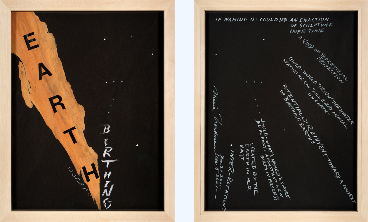 Maria Nordman, THE EARTH BIRTHING, 2021–22 (front of drawing on left, back of drawing on right). 2-sided collage on Canson paper and paper sections from bark of a molting Australian Eucalyptus tree, ink, crayon, white pencil, glue, lettering. Paper: 19 5/8 × 25 3/8 inches. Courtesy the artist and Marian Goodman Gallery. Photo: Maria Nordman and Alex Yudzon. © Maria Nordman.