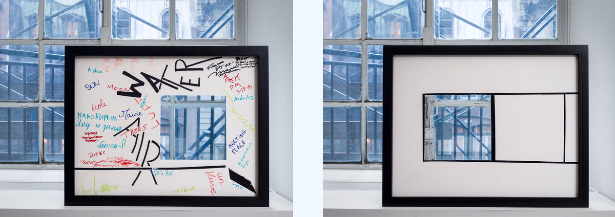 Maria Nordman, Air Water, 2015 (front of image on left, back of image on right). Paper, marker, Mylar, crayon. Paper: 20 × 26 1/8 inches. Courtesy the artist and Marian Goodman Gallery. Photo: Maria Nordman and Alex Yudzon. © Maria Nordman.