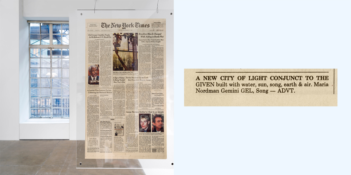 Maria Nordman, Dec. 31, 1999 (detail on right). Newspaper. 11 5/8 × 13 1/2 inches. Courtesy the artist and Marian Goodman Gallery. Photo: Maria Nordman and Alex Yudzon. © Maria Nordman.