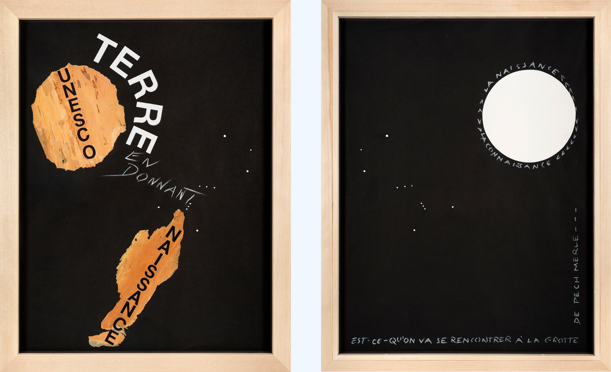 Maria Nordman, LA TERRE EN DONNANT NAISSANCE, 2021–22 (front of drawing on left, back of drawing on right). 2-sided collage on Canson paper and paper sections from bark of a molting Australian Eucalyptus tree, ink, crayon, white pencil, glue, lettering. Paper: 19 5/8 × 25 3/8 inches. Courtesy the artist and Marian Goodman Gallery. Photo: Maria Nordman and Alex Yudzon. © Maria Nordman.
