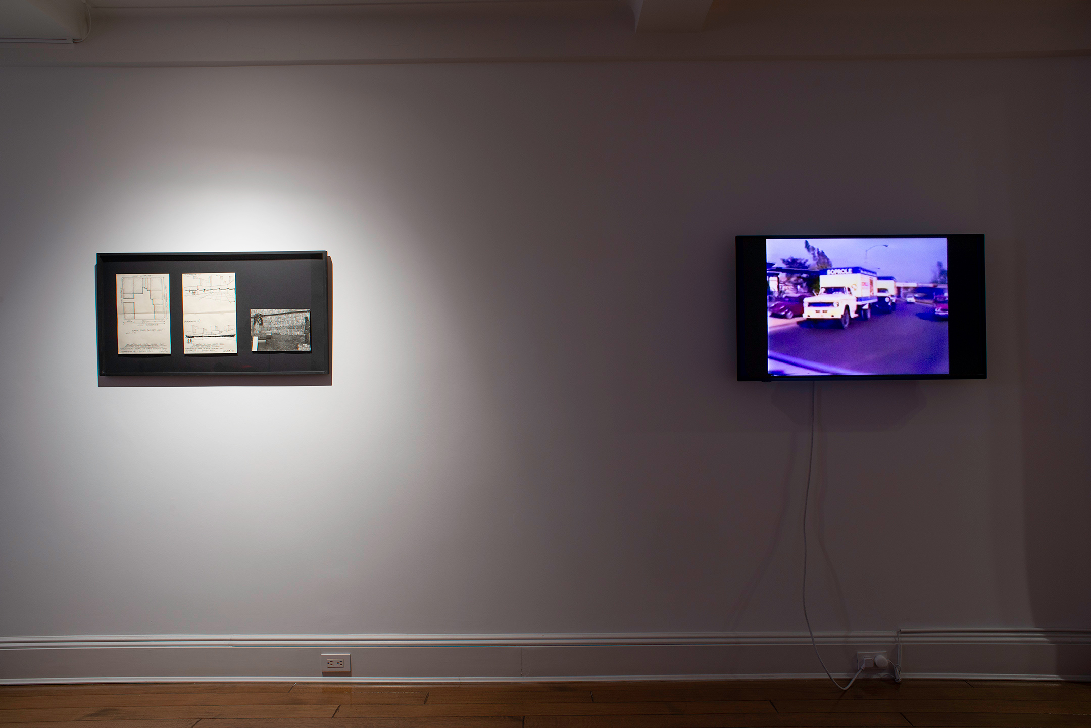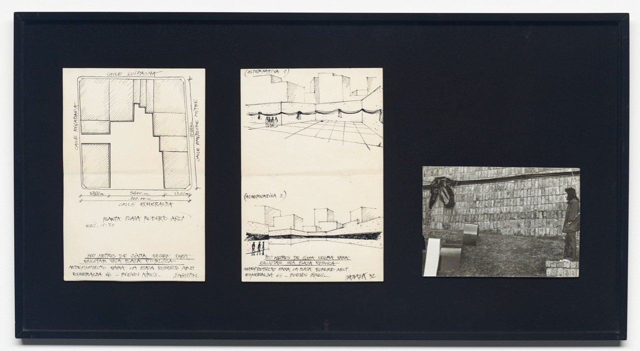 The specter of death also haunts Horacio Zabala’s 300 Meters of Black Tape to Mourn a Public Square (1972), another work invested in the measurement of public space. Invited to participate in an outdoor sculpture exhibition staged in a Buenos Aires plaza, Zabala hung a black sash on the surrounding walls, every so often tying it in a bow. Artists had to be subtle at this moment if they wanted to say anything critical in public space (let alone mourn its passing), but even Zabala’s rather opaque parade of fabric was too conspicuous (when you’re a censor, I guess, you can’t be too paranoid), and the authorities quickly took it down. The two sketches and single photograph included in this exhibition are all that remain of the artist’s intervention, a tiny archive made all the more precious by the fact that every other part of the work has disappeared—and who knows what and who else.
