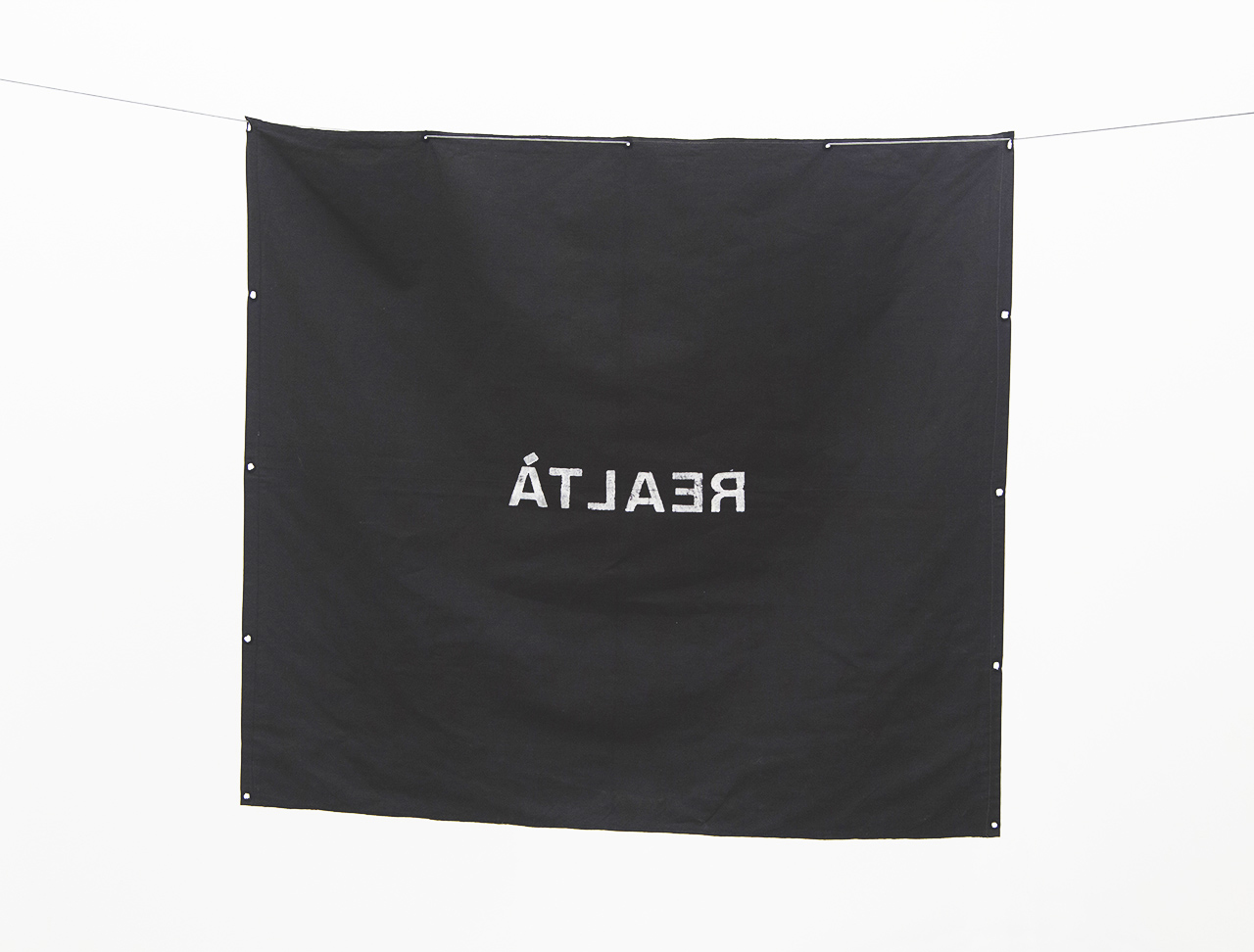 Four out of the five pieces in this meticulous show, in fact, are more documentation than standalone works, though this is a distinction that the conceptual art of the time often sought to trouble. Still, Antonio Dias’s Eye Patch (1969), hung on a wire traversing the gallery, stands out. Before moving to Italy in the late 1960s (after a stop in Paris for ’68), Dias worked in his native Brazil crafting a bodily brand of Pop art that stressed the violence of the country’s military regime. Upon arriving in Italy, however, he mined a more conceptual vein (think, for example, of Joseph Kosuth’s stark definitions), and yet he maintained an activist’s desire to engage the real. His Eye Patch is a kind of portable public intervention, a black flag with the word REALTÀ (Reality, in Italian) painted backward.