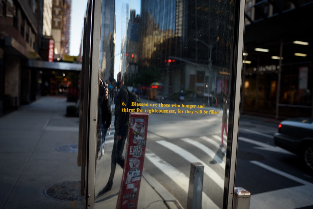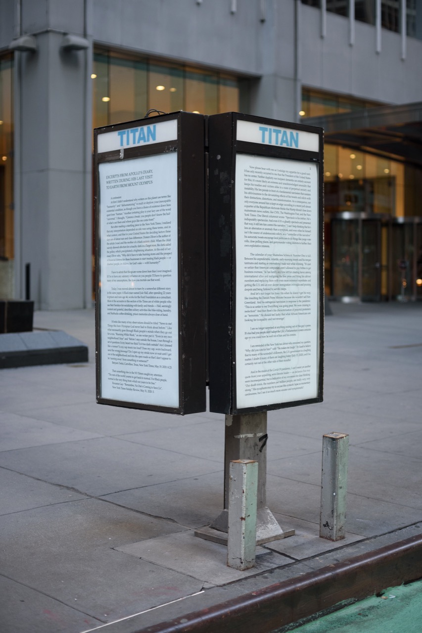 On the northwest corner of Fifty-Second Street and Sixth Avenue there is a long letter from the god Apollo flanking the sides of a Titan payphone kiosk: “Now please bear with me as I indulge my appetite for a good rant,” the missive begins, and away it goes. A couple blocks to the north, on the east side of the street, there’s a mirrored stall emblazoned with beatitudes from the Sermon on the Mount: “Blessed are those who are persecuted for righteousness’ sake, for theirs is the kingdom of heaven.” Both declarations belong to TITAN, an exhibition organized by artist Damián Ortega and gallerist Bree Zucker, installed on twelve Titan phone booths spanning six blocks of midtown Manhattan. A provocative group show hung on a readymade structure, it is also a status report on possibilities for public art today.