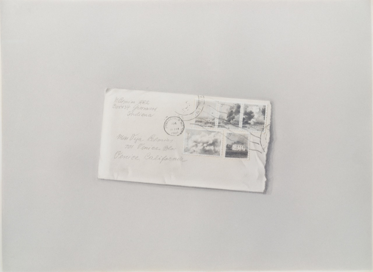 Vija Celmins’s current retrospective at the Met Breuer, To Fix the Image in Memory, begins with a small painting of an envelope, which the museum has cordoned off with an awkward stanchion. The painting is hung to the right of the introductory wall text, like an illustration, but it’s lushly rendered in a way that few of the artist’s other works are. The first time I saw it I was reminded of Wayne Thiebaud’s impastoed canvases of cakes and ice creams, but here the scene is solemn and gray (no sweets). The envelope is opened—the flap juts out to the right at a sharp angle, casting a dark shadow—but we can’t tell if the letter’s been taken out, and since the envelope is face down we can’t see who sent or received it. (The red, white, and blue lines checkering the border tell us it’s airmail.) The work possesses a vague idea of connection, but what comes across more strongly is a failure—or refusal—to communicate.