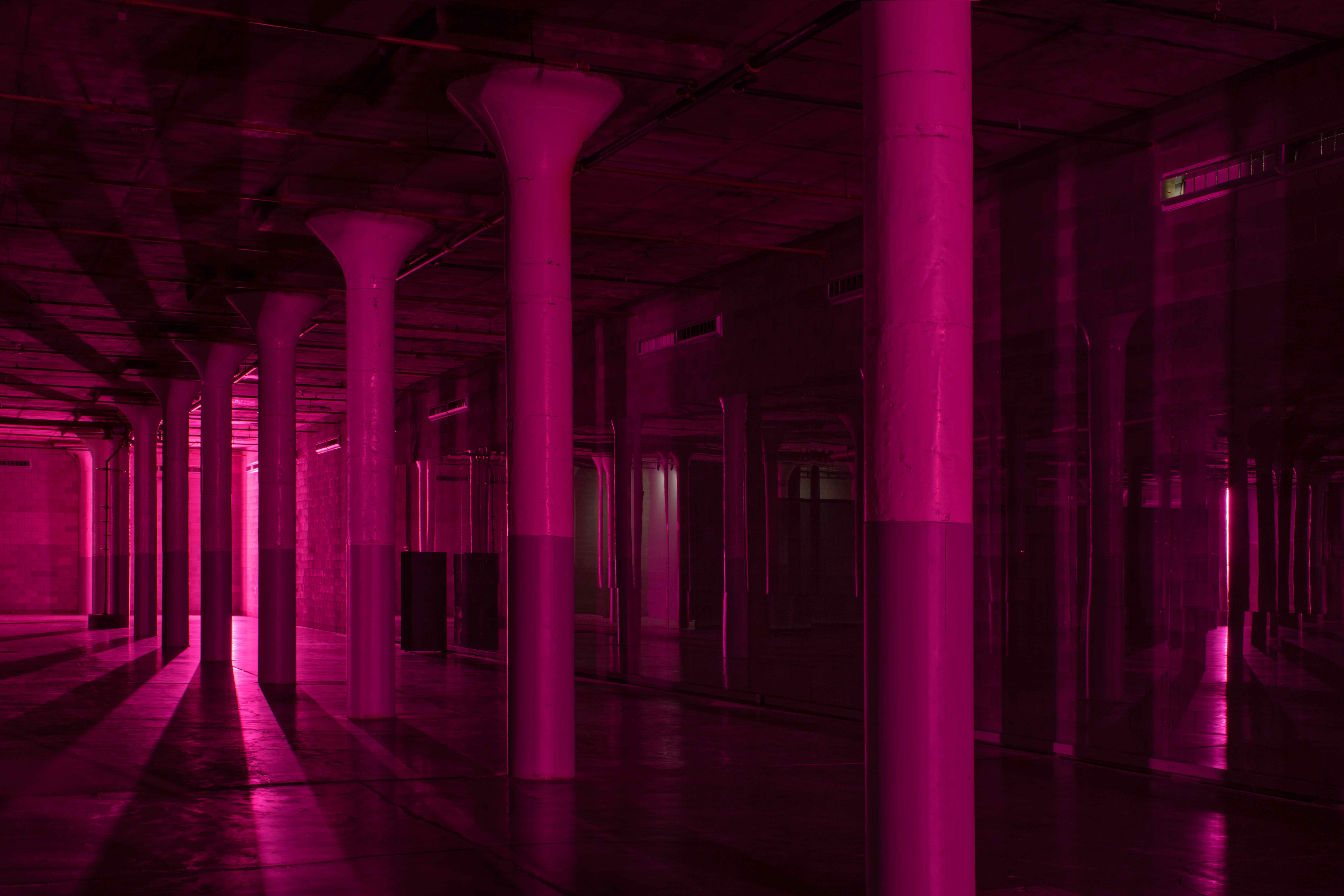 Intermittently, a panel of shutters claps open and shut, allowing a sliver of daylight to momentarily cut through the space, an architectural feature Craig borrowed from Panorama Bar, the dank boîte above Berghain, Berlin’s labyrinthine power plant turned club. LED poles are affixed to the room’s four corners, splashing red, blue, purple, and white hues onto the rows of concrete columns that fortify Dia’s upper level. They seem to pulsate in syncopation with the music—to its backbeat—and at no point do they overpower the aural primacy Craig establishes with his spare install. This darkened expanse punctuated by flashes of light evokes Dia’s other artwork meant for dim ambulation, Walter De Maria’s The Lightning Field (1977). Located in the high desert of New Mexico, De Maria’s massive storm-conductor is made of four hundred steel rods spiked into the earth and arranged in a grid formation measuring one mile by one kilometer. Viewers are invited for one-night stays to witness (or eagerly await) bolts of electricity strike the artwork in front of them. I made the trek in 2014 and spent the night below a quiet sky, kept up because of a calf who had wandered onto the grounds and mooed in loud persistence somewhere from the stygian landscape before me—a sonorous basso moo—all night long.