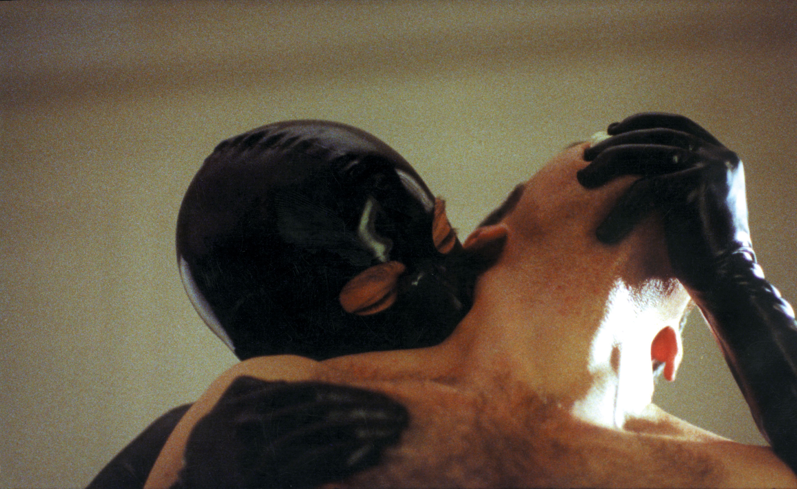 O Fantasma begins with a shot of an unlit hallway where a highly agitated Doberman scuffs a closed bedroom door, whimpering to be let in. Inside the bedroom, we meet Sérgio in his “phantom” guise, a black latex bodysuit and mask, penetrating a gagged and handcuffed stranger to completion. Sérgio’s glossy rump dominates the screen, but a hole in his costume shows the cleft of his ass and acts as a foible in his plastic-becoming, revealing the phantom to also be hot-blooded and made of flesh.