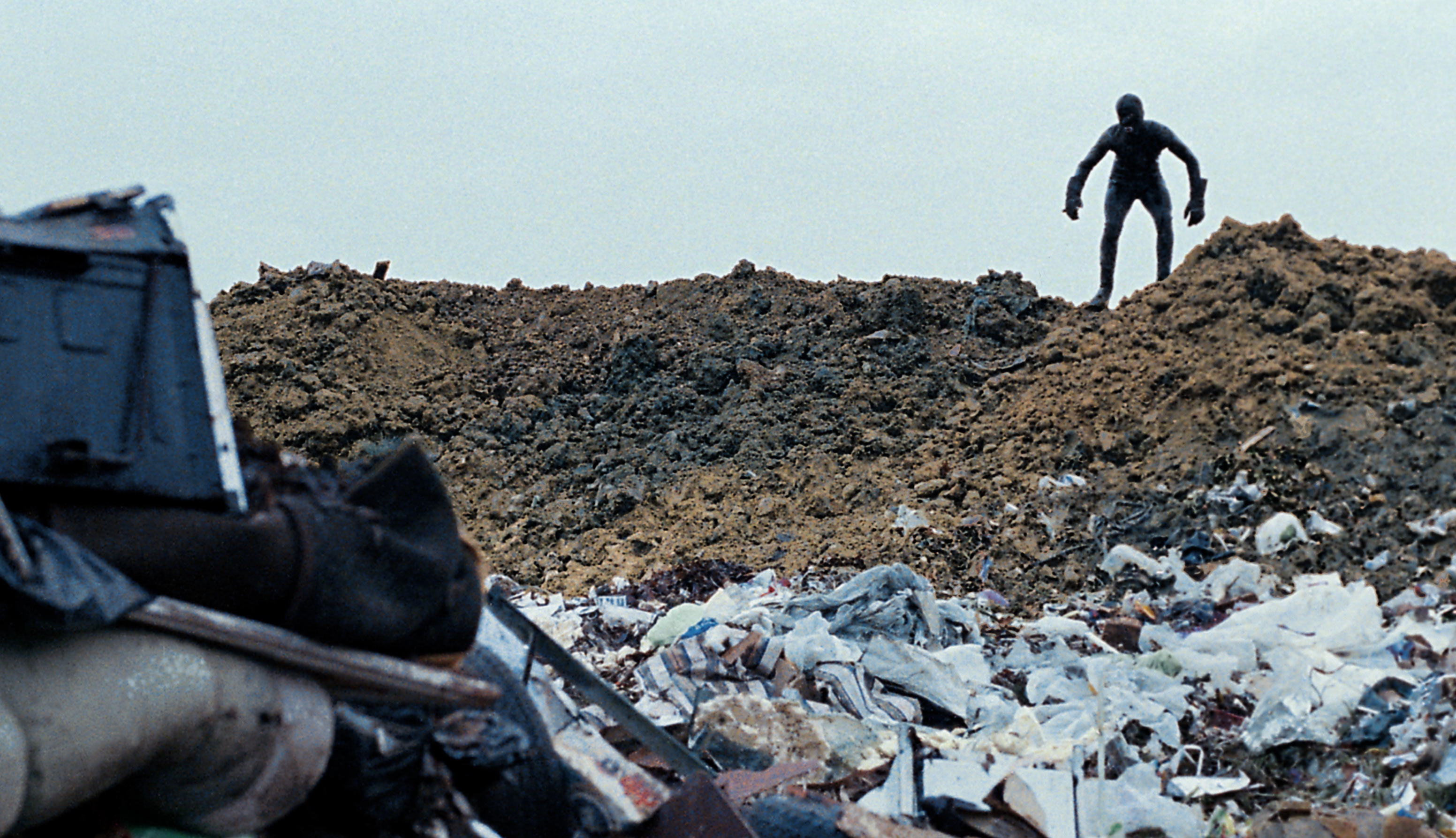 The principal conflict in the film, unrequited love, is sparked by João (Andre Barbosa), a cute motorcyclist who is unmoved by Sérgio’s beauty. Still, Sérgio makes do. He rummages through João’s trash, keeping a pair of the adored one’s torn Speedos and motorcycle mittens as his own. In one scene, Sérgio breaks into João’s bedroom, and, holding a Godzilla figurine he’s grabbed from his beloved’s desk, unzips and soils João’s bed with splashes of urine. The audacious final act depicts Sérgio after he is properly rebuffed by João. He reemerges in his one-piece bodysuit to kidnap João, but abandons the attempt and leaves the city for the landfill, where, contained by his second skin, he traipses across mountains of Lisbon’s trash against a purple dawn. He gets on all fours to gnaw at bags and the scraps inside, hunts a rabbit for game, and defecates inside the facility’s central building. In the final shot, the phantom bounds out a doorway through which Rodrigues’s camera pauses to frame a horizon: freshly razed land soon to be covered with what humans discard.