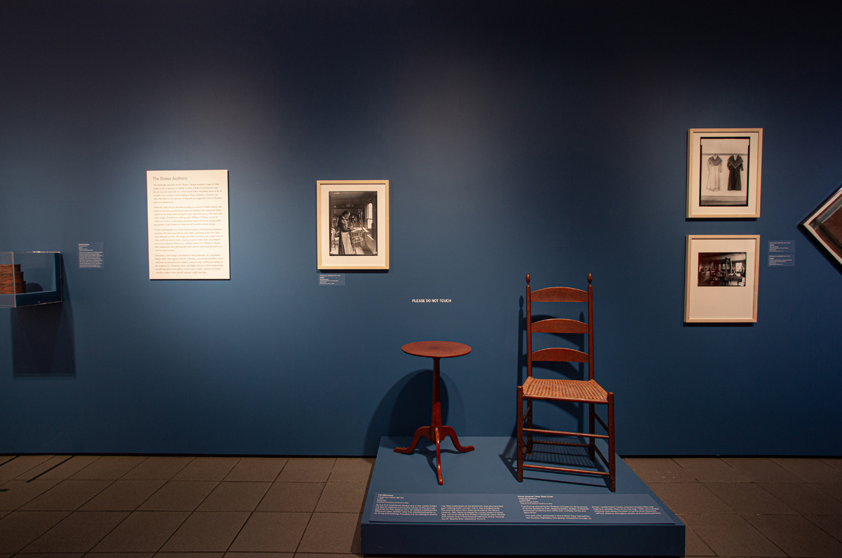 Anything but Simple: Gift Drawings and the Shaker Aesthetic, installation view. Courtesy American Folk Art Museum. Pictured, center, on platform: Candlestand, ca. 1840. Background, on wall: Untitled gelatin silver prints by William F. Winter.