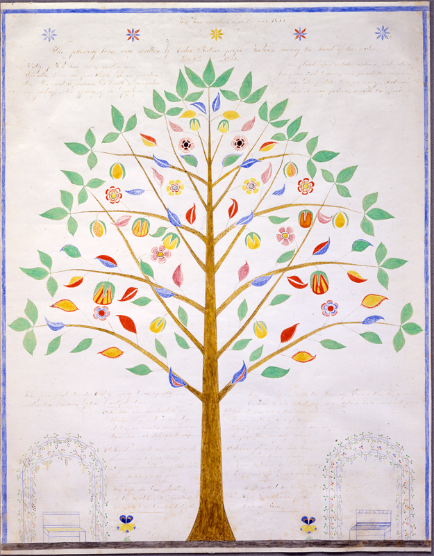 Polly Collins, The Gospel Union, Fruit-Bearing Tree, 1855. Ink and watercolor on paper, 31 3/16 × 25 7/8 inches. Courtesy Andrews Collection, Hancock Shaker Village.