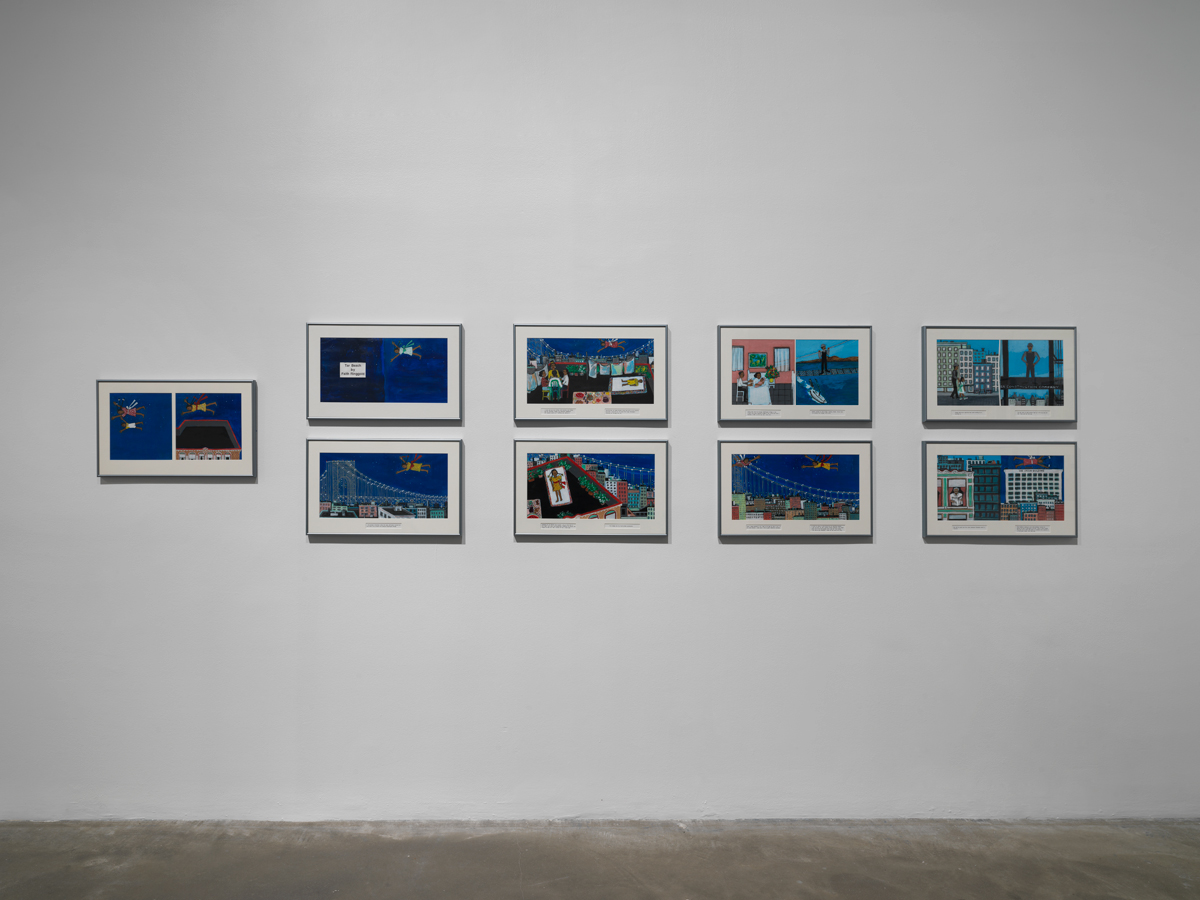 Intersectional before the term was coined, Ringgold’s coextensive painterly and protest activities explore the ways that Black women were left out of both the civil rights and mainstream feminist movements—an exclusion parallel to their lack of entry into the museum. The exhibition weaves a Black feminist thread throughout. One sees it in the 1971 mural For the Women’s House, located until the show’s opening at Rikers (soon to be on extended loan to the Brooklyn Museum), as well as in the fabric paintings she began making in the 1970s, which—as the artist quips in an interview with Gioni for the show’s catalog—were easier to carry around and exhibit across the country as “nobody wanted to pay for shipping.” These un-stretched works, some based in narrative, others abstraction, include the famed story quilts Ringgold began creating in the early 1980s. Also of note are her literary forays into children’s books, including the acclaimed Tar Beach (1991), whose stunning drawings are given their own room in the exhibition.