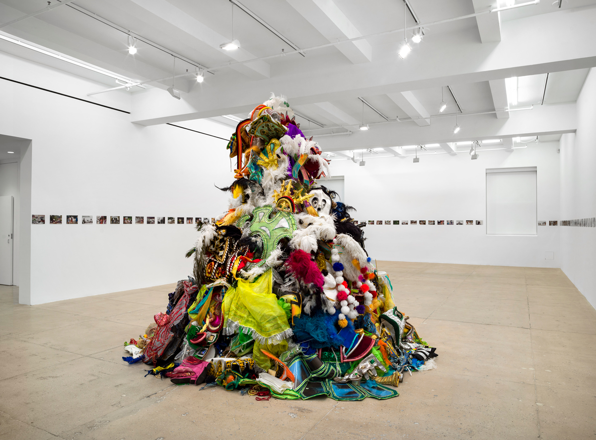 In the north gallery stands Um Monumento às Fantasias Descartadas (A Monument to Discarded Fantasies) (2003), a conical pile of colorful costumes near ceiling height. Collected on Rio streets after Carnival, the still-vibrant textiles and accessories have been wrested and “upcycled” into a sculptural ode. Are there costumes through and through, or is there a hidden structural armature underneath? The slope at which the cone rises would suggest the latter.