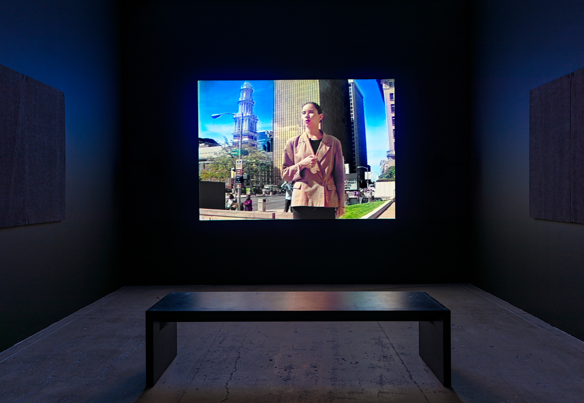 Andrea Fraser, installation view. Courtesy the artist and Marian Goodman Gallery. Photo: Alex Yudzon. © Andrea Fraser. Pictured: This meeting is being recorded, 2021.