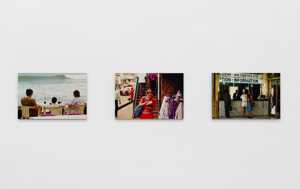 Exiting the viewing room from one guided tour, I noticed, among the eighty-two snapshots that make up White People in West Africa (1989/1991/1993), tourists on another. Many of the images in this series are mundane—folks dining at leisure, or at reception desks and poolside, mostly in Ghana—while some feel pointed, as when a Black figure is juxtaposed with a white elbow protruding from an ambulance window, or when Fraser is surrounded by Black children in a composition worthy of missionaries and UNICEF. The photographs wrap around three walls and a nook in a line, stopping midway on the largest wall, intimating an incomplete and ongoing process of repetition and circularity in colonial relations, a circle not yet closed.