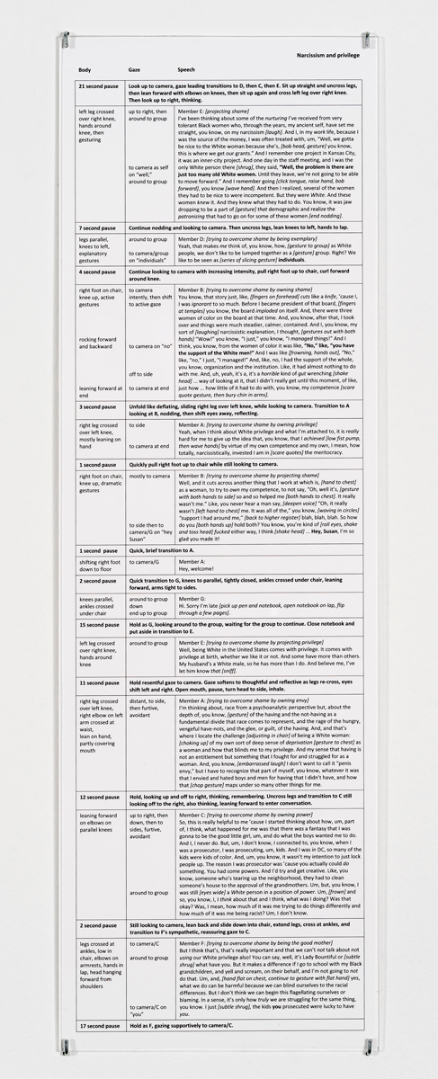 In relating This meeting to another artist friend, I was met with silence. A pregnant one signaling polite incredulity. I suspect her reaction aligns with those of many non-white (and some white) colleagues, and in her silence are questions: What is it to insist on the ethnicity of whiteness in an effort to decenter it, only to re-center it as content? Is there a crucial distinction between whiteness declared vs. undeclared, or can the self-reflexive declarations yield more business as usual at another level, in another guise? I do see poignancy in this bind, but also noted that the “Narcissism and privilege” page of the rehearsal script is the longest.