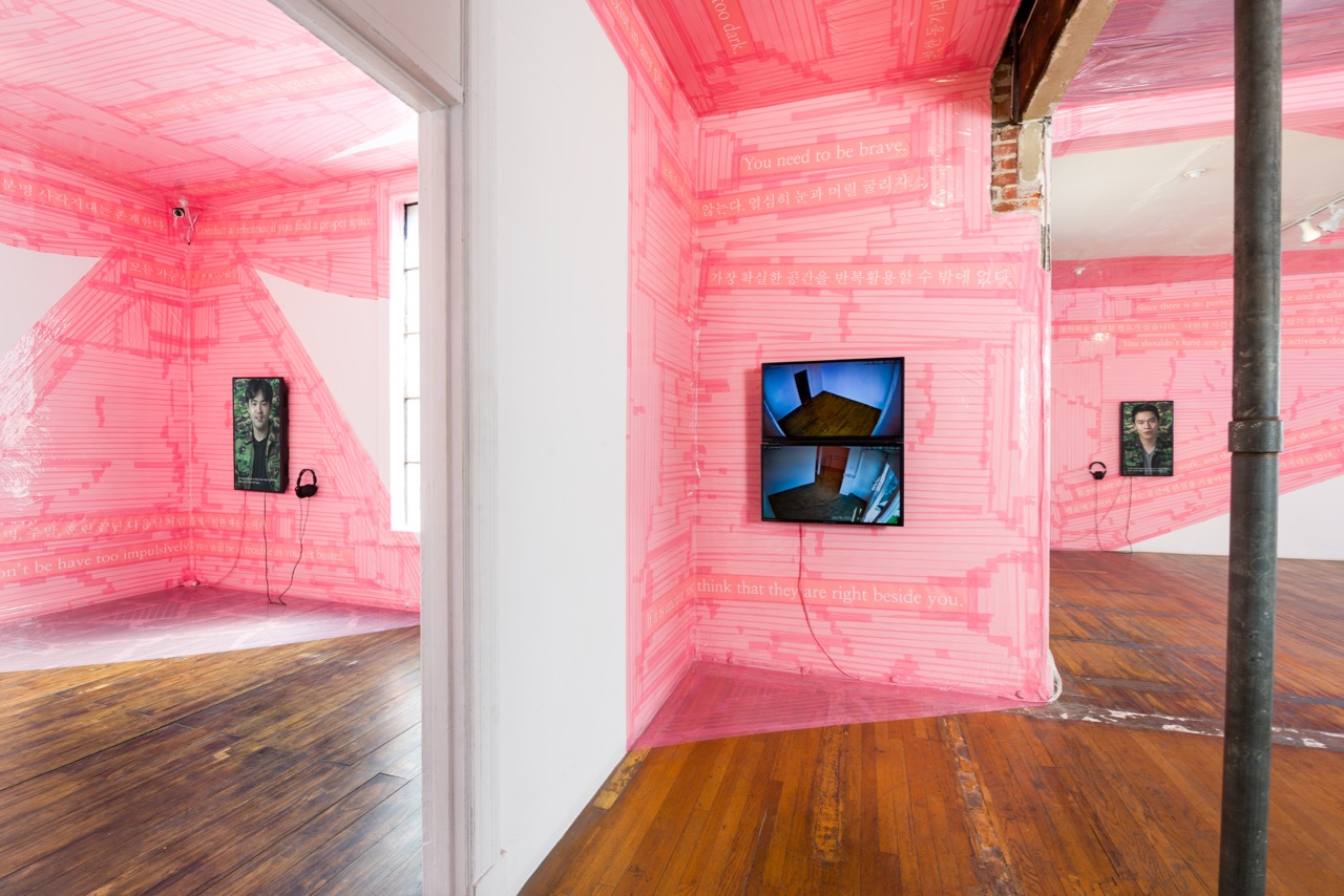 Excerpts from the interviews in Korean and English are rendered in vinyl wall lettering in a similar gauzy peach/pink that is interwoven into the tape throughout the installation. Instructions and advice range from practical (Be ready for the moment that somebody will suddenly enter) to sanguine (Observe. There are patterns in the military. The answer is in the limited space and timetable) to pithy and oblique (Genius steals. Steal the know-how of a sergeant about to be discharged from his service) to commiserative (Don’t feel guilty. Everyone, including you, does this somewhere).