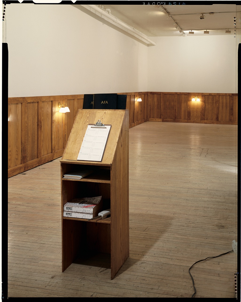 Another greeting, by another artist/gallerist who has departed too soon, came to mind on the train ride back into Manhattan: that of Jackie McAllister, who, as I learned from a publication in one of the show’s two reading rooms, held the official title of vice president of AFA from 1989–92. When he recognized you in the gallery, Jackie had a distinct way of saying your name as a greeting. There was a formality in it and warmth, akin to the Japanese honorific imperative irashaimase, derived from iru/iku/kuru (literal translation: Please be/go/come!). Never officious or robotic as sometimes encountered in stores or restaurants, Jackie’s way was as if to say, I see and acknowledge you. We are here, and it’s time to get to the serious business of active looking and hanging out, of considering together what is being proposed. It was a challenge as much as a welcome, in one crisp enunciation of your name. I like to think that just such a challenge was inherent in Hearn and de Land’s sociality: that art could be something more than the historical succession of discrete objects.