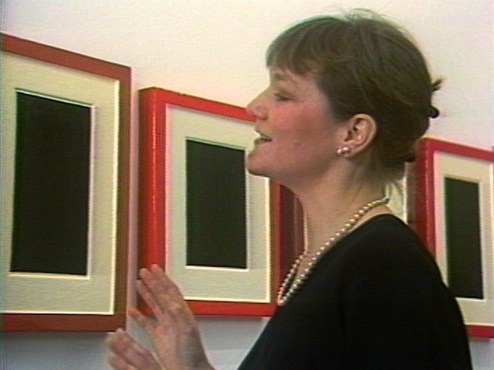 On another video monitor, another gallerist presents another show: Lutz Bacher’s Playboys (1993) at Pat Hearn Gallery. Petite, power-suited, and coiffed in a fabulous updo (the higher the hair, the closer to God), our host here is Hearn herself. The shaky then ambling camera, jerking edits, and poor resolution are at odds with her presence, which is all poise, professionalism, and calm. The deskilled/amateur aesthetic suggests both a proto-vlogger channel and Hearn’s openness to experimental modes of art distribution, such as the televisual. Her abbreviated commentary with a few obligatory Vanna White gestures also signals a performance of a kind, but her composure feels unscripted.