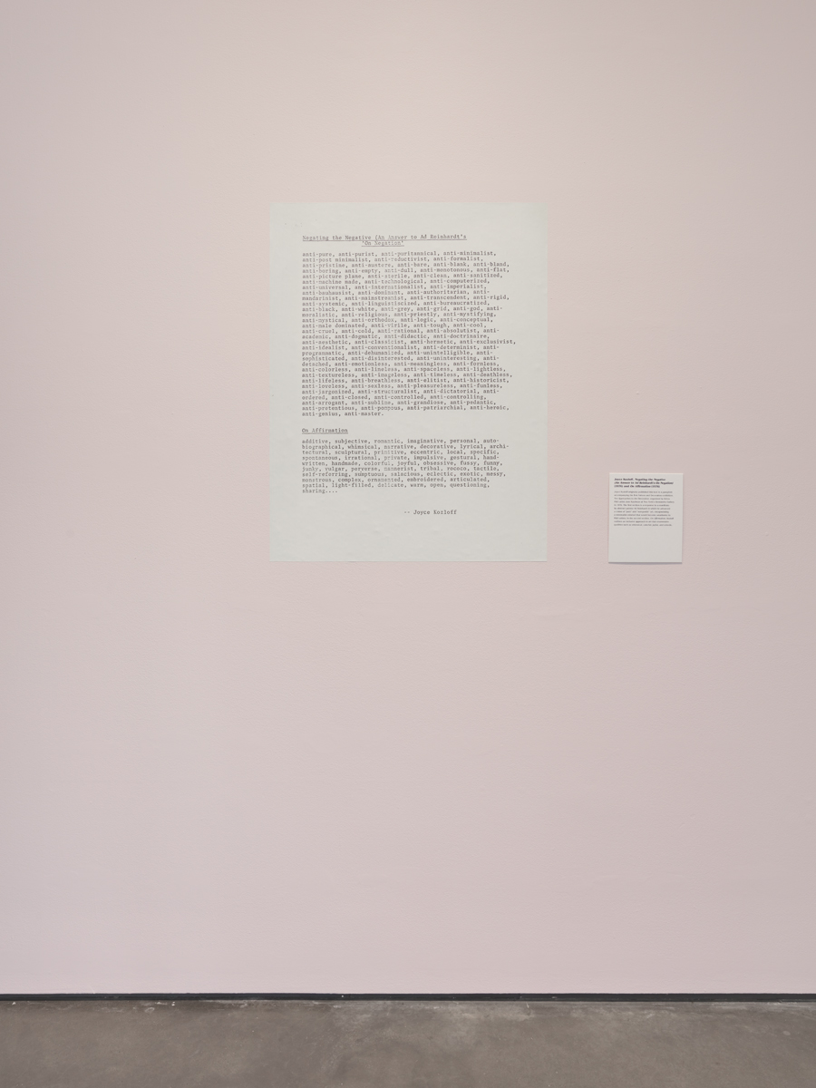 Thinking again about Kozloff’s 1976 text “Negating the Negative” alongside Sylvia Sleigh’s oil painting The Turkish Bath (1973), which features a nude male “harem” of art critics sympathetic to P+D (John Perrault, Carter Ratcliff, and Lawrence Alloway as odalisque), had me wondering if such inversions could be analogous to the writerly “error” that is the double negative. Repetitive and potentially confusing—both text and picture are displacements of a kind in any case. At the show, two ladies of a certain age blocked my view of Sleigh’s painting for a good while. At her companion’s elaboration on the composition, the frailer of the two marveled, louder than she probably intended, “Well, that is powerful!” At her booming vocalization, I felt a bit shamed, in my impatience. No doubt they were not the only two whose hard-won, long-held passions were affirmed by the ethos of this show. And that’s not nothing.