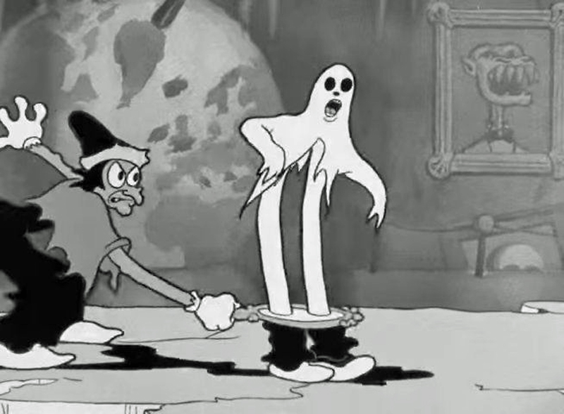 Music is literally what gives this animation its motion—characters run, bob, waltz, twirl, bounce, swell, shrink, transform, hoot, holler in time with the soundtrack, perfectly synched by a device called the “cue-meter.” It also signals the transitions between different spheres of being: when you hear that wah-wah of the trumpet with its stem-in Harmon mute, or the minor-keyed chorus of horns, you know a dark evolution is about to take place. In Betty Boop: Snow White, these sounds usher in Koko’s mesmeric song, which tells of his baby stretched out on a long white table / She so sweet, so cold, so fair, and imagines his own funeral, the details of which in turn act upon his animated body. Bury me in my straight-leg britches, for instance, sees a pair of ghostly trousers run down Ko Ko’s flexile legs, sliding all the way to the ground, only to be pulled back up by an extra pair of hands sprung from beneath his tattered shirt. When the pants reach his shoulders, a pair of eyeballs pop into Koko’s previously hollow sockets, rolling gleefully.
