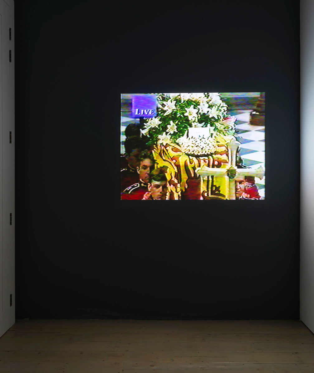 Another video, another collapse of empire: Untitled (Diana) (1997) is a single-channel projection of live footage from Princess Di’s funeral in September of that year. The camera is focused on the top of her coffin as it is borne down the checkered aisle of Westminster Abbey by solemn-faced pallbearers. Only a few minutes in length, the footage begins when the coffin, festooned with blooming tulips, roses, and lilies that sway with each forward step, enters the frame, and starts again, with a glitching stammer, when it has almost passed beyond. The church bells toll relentlessly in mourning, a reckoning that never ends, that becomes every moment of every day, scented with fluted white flowers that never die. An atmosphere, a texture, a mood fills the air, and some of the heart’s chambers.