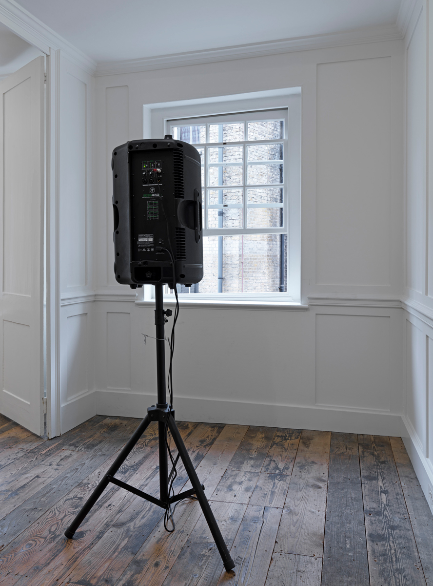 The art of Lutz Bacher captivates with echoes, deferrals, and absences, including that of the American artist’s real name (never revealed, even after her death, at age seventy-five, in 2019, though it has been said her husband, the astrophysicist Donald C. Backer, was heard to call her Susan). At Raven Row, AYE!—titled for a Post-it note exhortation found in her archive—brings together a selection of works loosely grouped around the use of music, sound, and voice. Multimedia installations, videos, and sculptures from between 1997 and 2016 are sparely arranged across the gallery’s three floors. Sound is amplified (radios, giant speakers) and muffled (a depth of sand, a mountain of acoustic foam), moving images multiply and loop, voices borrowed and sampled are distorted, eerie, mesmeric—not so much speaking or singing as emoting, embodying, expanding. As Roland Barthes wrote, “is it not the truth of the voice to be hallucinated? Is not the entire space of the voice an infinite space?”