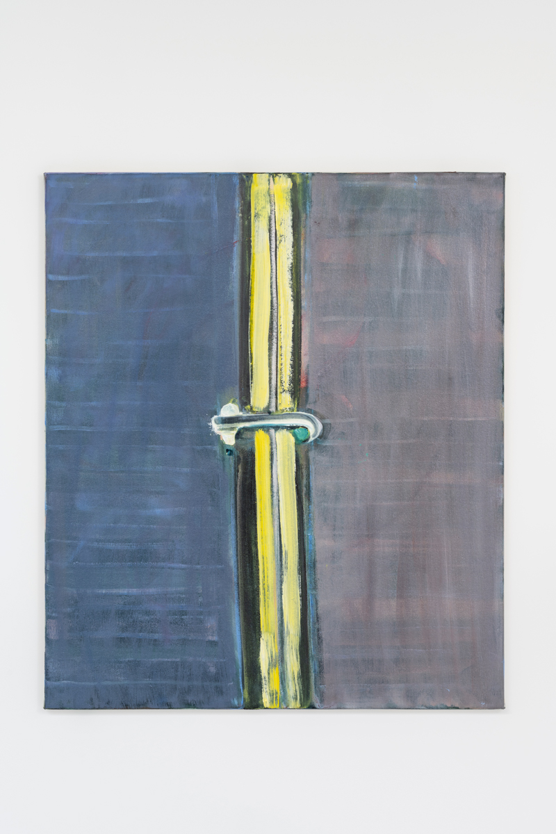 Across fifteen pieces of varying sizes, hooks are both literal and figurative (or, given their painterly nature, I suppose, figurative and figurative). Rest Before Change and Blue Shutters (both 2022) show the interior of European-style shutters, each locked at the midpoint with a hook. In the former, one shutter is colored dusky indigo while the other is mauve-gray, both striped with faint white horizontals. The two flanks, flush with the canvas edges, are separated centrally by a vibrant stripe of yellow and white that is edged in black and fixed in the middle with a curving bright-white latch whose hook is deliciously limned with aquamarine. What might otherwise read as abstraction is fastened back to reality with simple hardware.