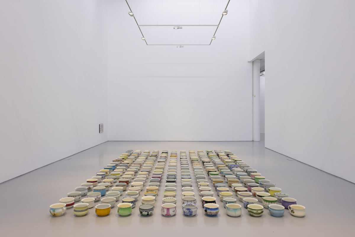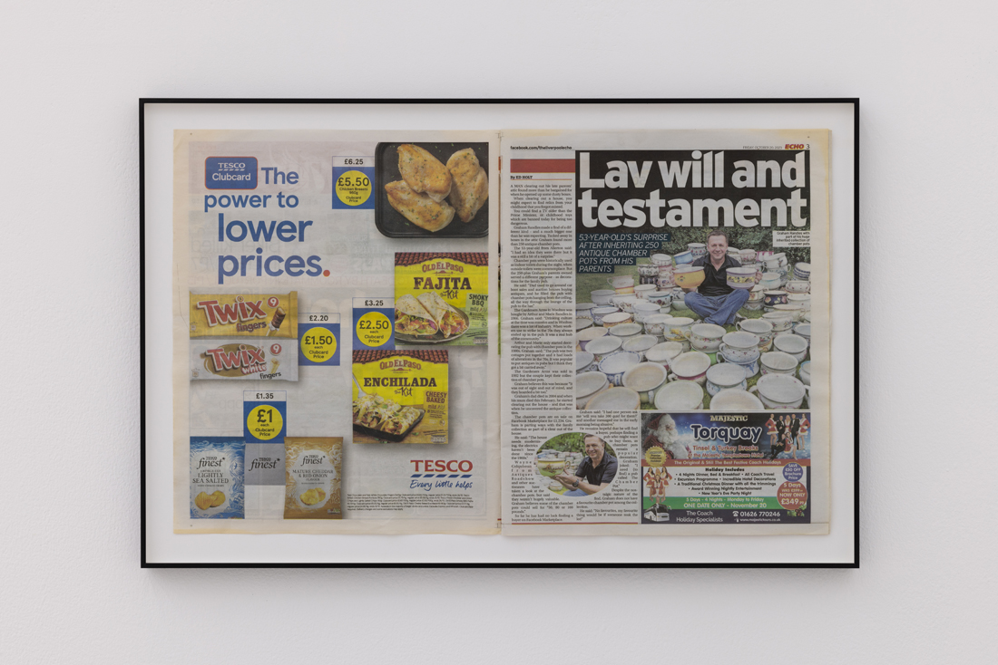 At the center of the center of the exhibition is a diptych of thwarted inheritance—absences, paper trails, empty vessels, and implements that serve no purpose for their apathetic heirs. Job Lot (late 1700s–2024) presents 240 porcelain chamber pots in a tidy twelve-by-twenty conceptual art–like grid. Nothing refines random personal effects (including cherished collections) like recontextualizing them in a gallery setting where they immediately become auratic, precious, worthy of scrutiny, while simultaneously undoing these readings as givens. (Cue Duchamp.) Embellish them with roses, chintz patterns, deco designs, bucolic scenes, what have you, these pots—so neatly arranged, so pristine—are, quite literally, toilets. But of course, it’s not that simple. A framed newspaper spread from the Liverpool Echo, under the title “Lav will and testament,” tells how fifty-three-year-old Graham Randles from Allerton inherited the antique vessels from his father, who spent years scouring the country for choice specimens to hang (unused) from the ceiling of his pub. As much as Randles appreciated the array, he eventually listed it on Facebook Marketplace for £1,234 in the hopes of raising money to fix up the family home.