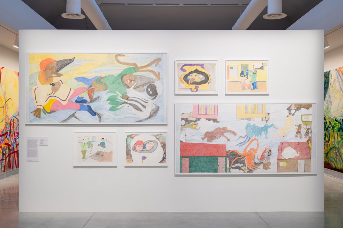 This formula of wall-based works (largely painting) plus sculpture—mirrored forms and themes—carries on throughout the exhibition and is at times repetitive and obvious. The Milk of Dreams is at its most thrilling when it is non-illustrative, when recurrent motifs and metaphors of becoming are troubled and complex, and when the works offer experiences rather than examples of metamorphosis and possibility. For, when we conceive of self-transformation via union with objects or technologies, surely this includes encounters with art? I was drawn to pieces like Candice Lin’s Xternesta (2022), a kind of eccentric mixed-media laboratory that conjoins science with traditional medicine, art with ex-votos, sacred with profane; Shuvinai Ashoona’s colorful drawings, in which animals from the Inuit imaginary—the walrus, the platypus, the octopus—live alongside denizens of the North in their stark, prefab housing; Sandra Mujinga’s neon-green installation, Sentinels of Change (2021), whose titular textile forms hang heavy and ominous, neither human nor other; Kaari Upson’s Portrait (Vain German) (2020–21), ten amorphous portraits made of layered resin, urethane, and pigment—mauve, pink, blue, green, brown, yellow, thickly encrusted, ghostly; and Miriam Cahn’s vibrant, violent, sensual paintings—babies, fists, floating, fucking.