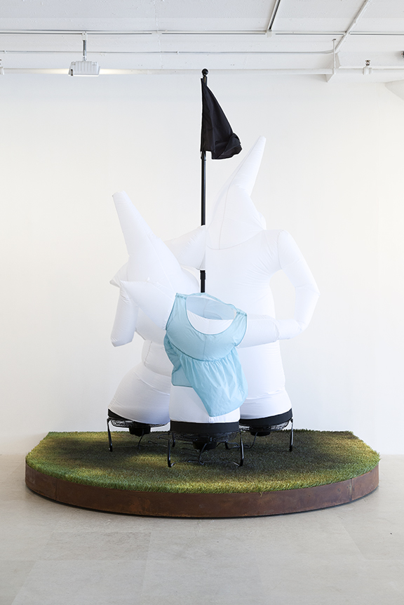 In the street-level gallery, Chan’s works are almost uniformly black. White, by contrast, is the dominant color of the “breathers” elevated on the eighth floor. Some of them wear little capes; the atmosphere is rather idyllic. Children play, or, once again, dance, now over a tiny rug (Dimposium). Two of them walk with their mother (Madonna With Childs), who encourages or pushes them to move toward one of the corners of the gallery, where there is nothing. A family hold hands around a pole on a small semicircular platform that is covered with artificial grass. Are they still in the midst of their travels or have they finally arrived? They seem to be staking claim to a territory: they are conquerors (or pirates). But is it really a family? De Se Moerae is the title. Another reference to a classical Greek trope: Moerae are the sisters (Clotho, Lachesis, Atropus) who spin human fate. Their flag here is black, evoking the more obviously troubled “breathers” on the ground floor. Here again, Chan creates a work animated by references. But to what end?