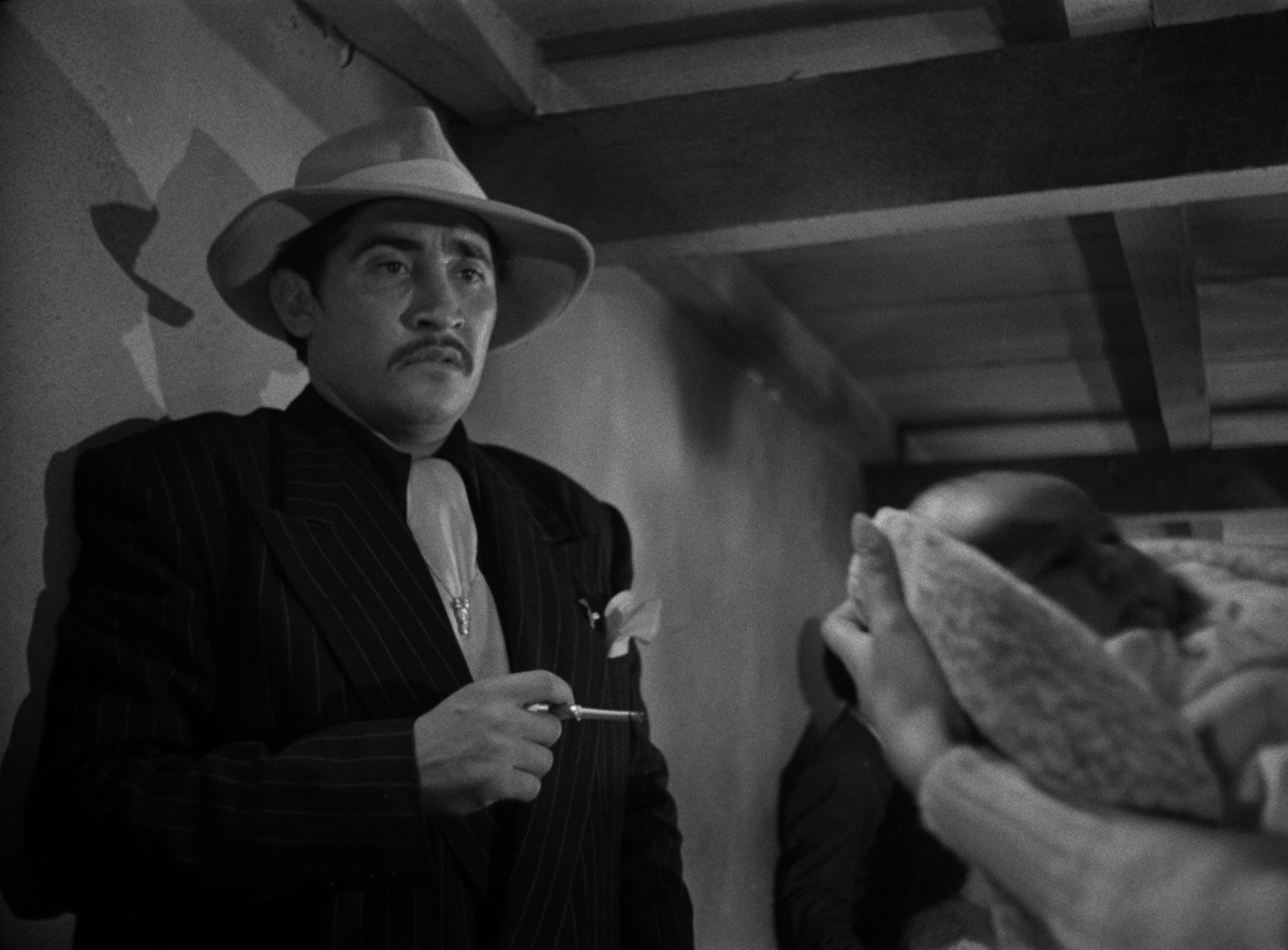 In Víctimas del pecado, Fernández and Figueroa exalt the star, capturing Sevilla in trembling close-ups and framing her, as if at the center of the universe, in both bustling two-story roadhouses and melancholic avenues cloaked in angular, noirish shadows. To say that Sevilla is the beating heart of the film might seem cliché, but in this case it’s justified, not least for the palpable strength that pulses from her screen presence, the hypnotics of her cha-cha. Sevilla, as Violeta, a nightclub headliner turned streetwalker, also seems to be the only person with a soul. When a coworker discards her newborn in a trash can, it’s Violeta who saves the infant, essentially adopting him as her own with the kind of outstanding moral commitment that dismisses all practical considerations, if not reason itself. The baby’s odious father, a zoot-suited, jitterbugging pimp named Rodolfo (Rodolfo Acosta), triggers a tragic domino effect that results in the club’s closure, forcing Violeta to turn to sex work. It’s not the scarlet women or the racy parties with shimmying chorines who corrupt the foundations of urban Mexican life; it’s the good-for-nothing machistas like Rodolfo who renege on their familial duties.