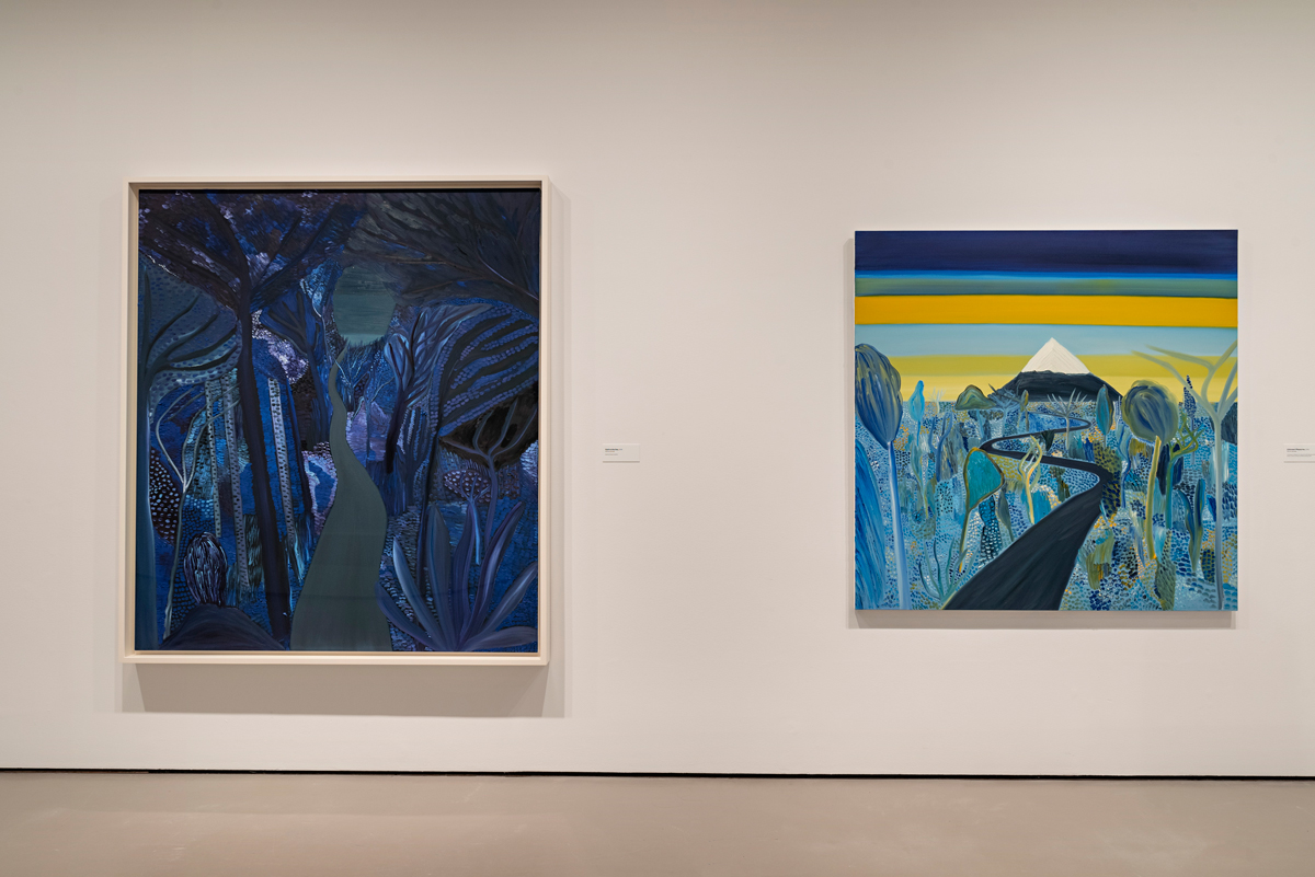 While in some later landscapes the surfaces are flatter, and the lines demarcating geographic features clearer, the atmosphere of solitary brooding remains. Three smooth bands of unvariegated color portray earth, ocean, and sky in A Walk by the Sea (2019), an image that might signal an association with Rothko if not for the exceedingly tiny figures at the water’s edge. This exact point of view is replicated in a different painting with the same title, although the striations of color are more mixed, the people slightly larger. Wong’s repeated inclusion of such figures—anonymous and typically alone—in domains abundantly populated by sun, sky, trees, and stars can certainly be understood as reflecting a psychological state. But his pictorial world is also one dominated by paths that press through forests and across fields toward uncertain regions. Human presence is obliquely alluded to rather than articulated with directness and detail. We are more palpably evident, Wong may be suggesting, in our journeys forward, in our ongoingness.
