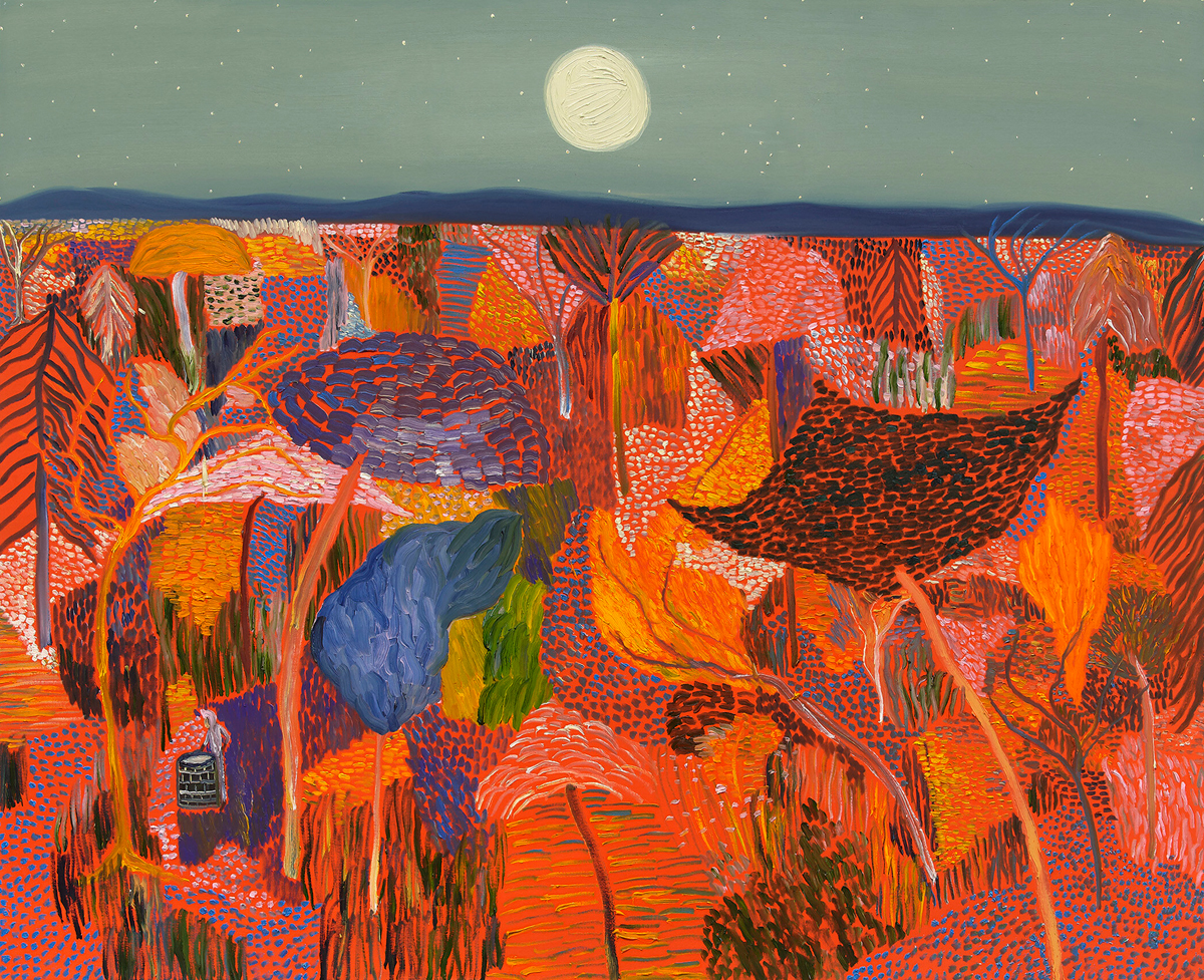 No doubt such an optimistic interpretation is as overdetermined and dubious as one that fastens on the artist’s depression and suicide. The painting that lends the show its title—The Realm of Appearances (2018)—might prove instructive in this regard: most of the canvas presents a multicolored field, one turbulent with flora; just above that, a full moon sits amid a placid pale-green sky. Wong’s realm of appearances is an ambiguous locale where chaos and serenity can occupy the same frame, neither state any more the case than the other.