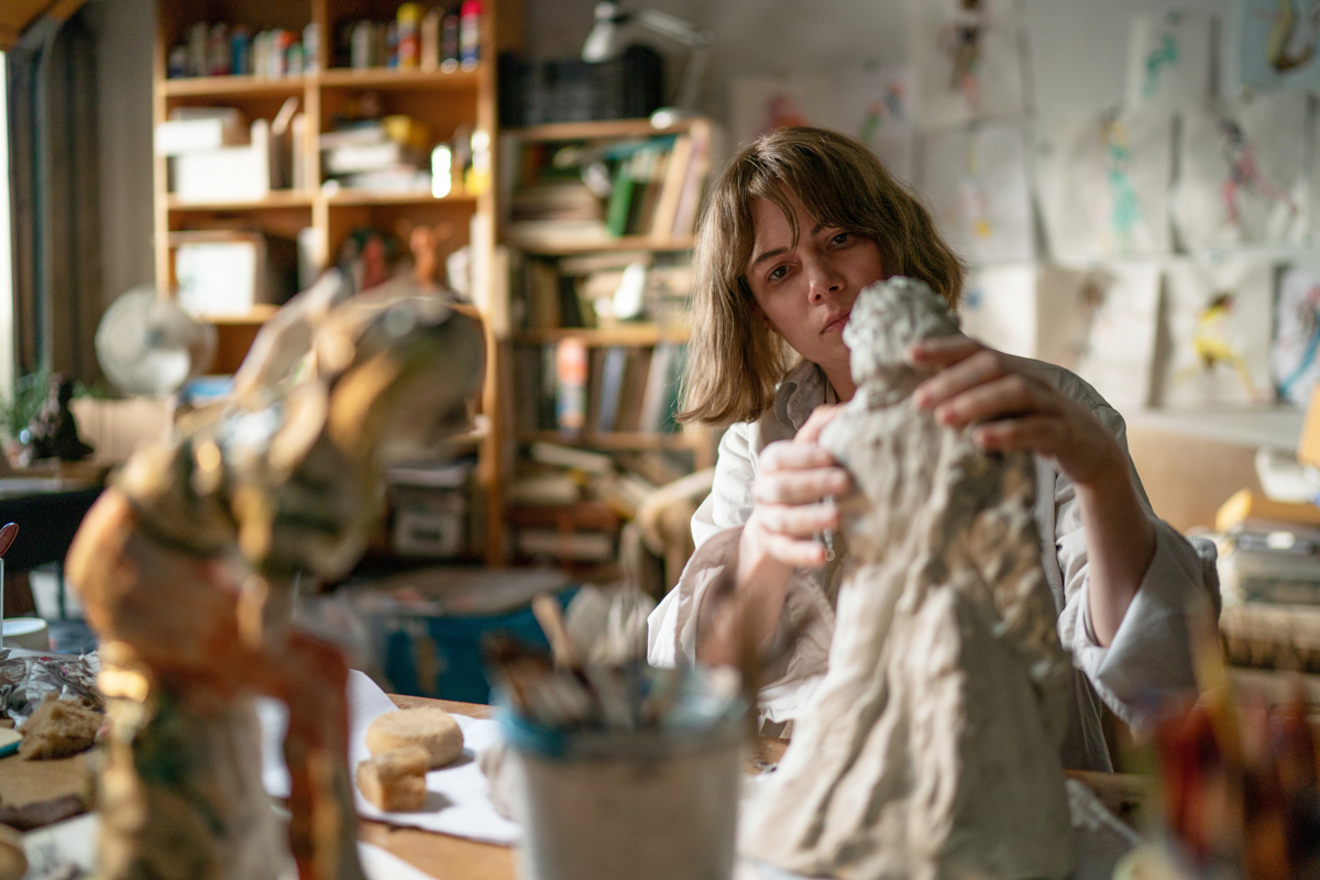 Working under her impatient mother (Maryann Plunkett) at a campus office and struggling to prep for her upcoming show (Jo, of course, is prepping two shows), Lizzy appears skeptical of her milieu and conscious of delivering exactly what is expected of her—in this case, another batch of haunted figurines, tattered women posed in various, weightless attitudes. Whether contained, unbridled, or temporarily held at bay, Lizzy’s unspoken ambivalence forms the center of every scene, framing at a slightly different angle the question at the heart of Showing Up: What makes a life in art-making worthwhile? Is there value in staying small, if not mediocre, as almost every artist will? In persisting toward another wine-and-cheese wake where your friends and family will at least pretend to admire, if not understand, what you’ve come up with this time?