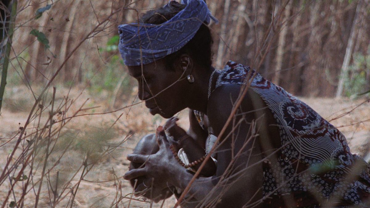 Something of a feminist thread runs through Sembène’s body of work, finding one of its more ambivalent but also more politically robust expressions in Emitaï. The film chronicles a gendered act of resistance by a largely Diola community in the Casamance region of southern Senegal, leveled against the French colonial forces’ extractive taxation demands and forced army conscriptions during World War II. Emitaï is structured around men’s chatty inaction and women’s mute activity. The Diola men are situated sitting at the foot of a tree, their palaver about the community’s loss of rice and sons, their sustenance and survival, seemingly interminable. The Diola women, silent save for their songs, are introduced in the midst of agricultural labor and—catalyzing the film’s dramatic unfolding—take on a stealth operation by hiding the rice stores from the French under cover of a bruise-blue night.