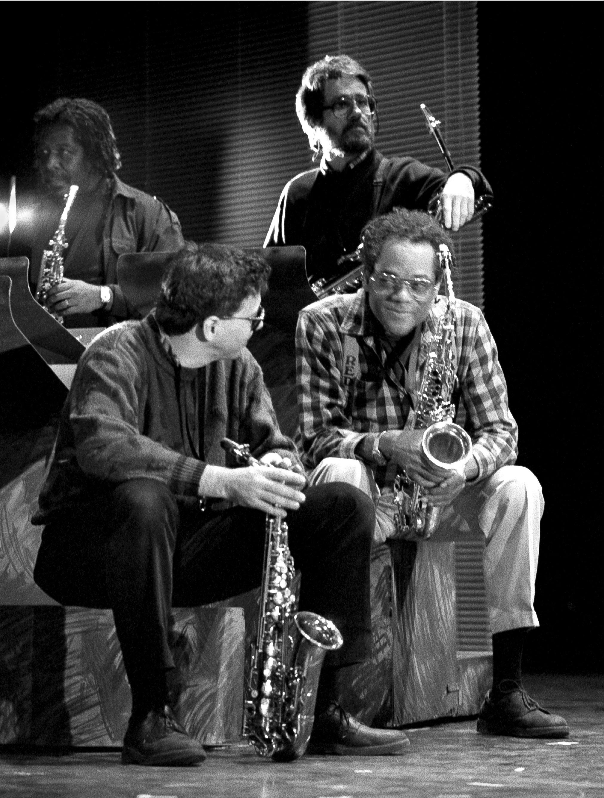 Julius Hemphill with Marty Ehrlich, Carl Grubbs, and Kenny Berger in rear, Apollo Theater, New York City, 1990. Photo: Michael Wilderman / jazzvisionsphotos.com.
