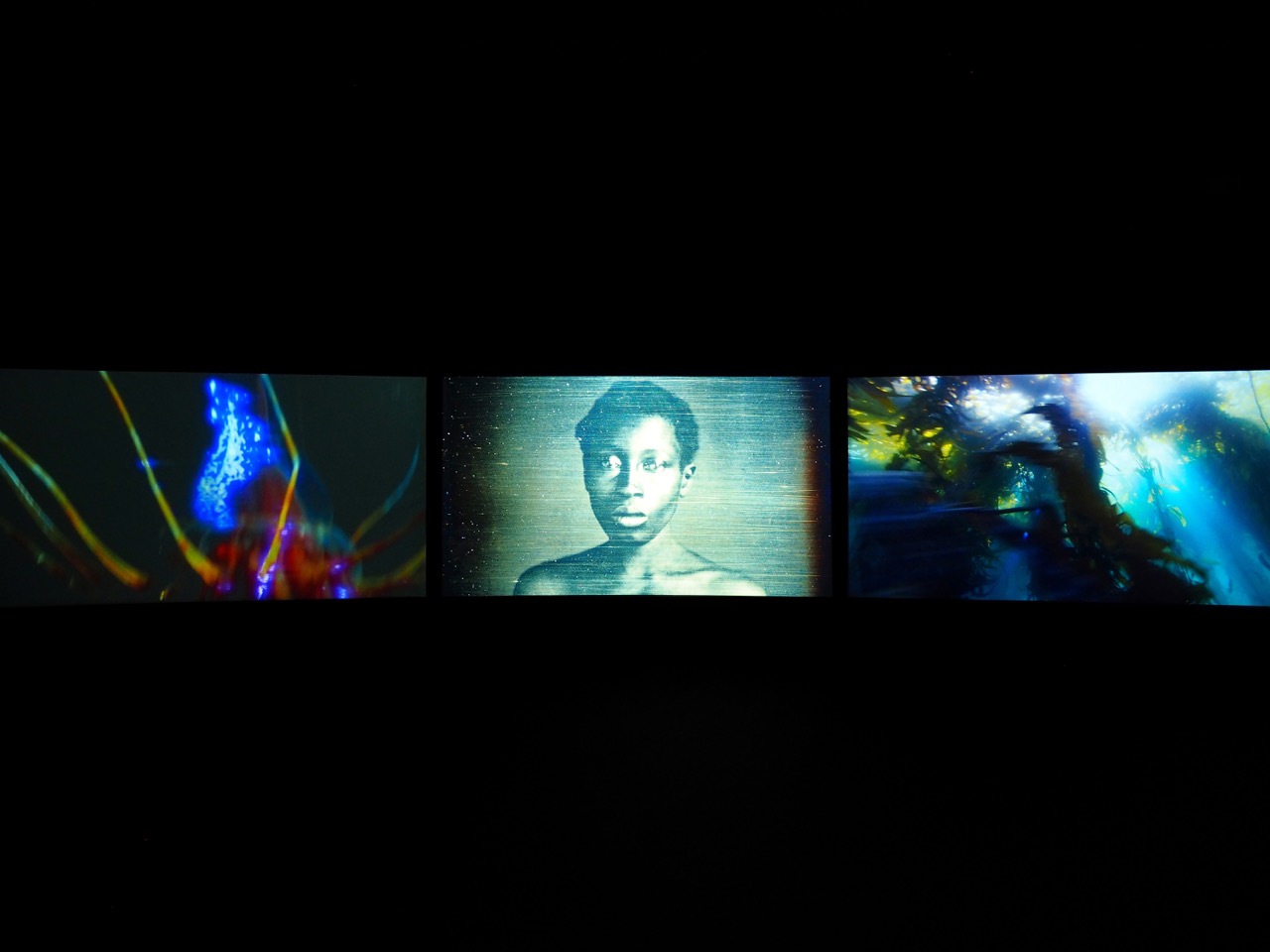 Water is intersectional. Water connects everything. “Watching the water,” artist Roni Horn once wrote, “I am stricken with vertigo of meaning. Water is the final conjugation: an infinity of form, relation, and content.” In Akomfrah’s piece, the sea is a mass grave, a liquid plantation, a test site, a mobile factory, a bibliothèque, a barometer of climate change. A fish caught in a net, a trapped polar bear, a whale being gutted: each screen, except when it turns pure blue, keeps disgorging dark, opulent images. It’s hard not to feel engulfed. Like many multichannel works, Vertigo Sea believes that more is more. It also relies a bit too heavily on familiar-seeming footage from the BBC’s Natural History Unit over which you half expect to hear David Attenborough’s voice. I found myself wanting to be estranged from the imagery, to experience the same awe and dread about maritime space inspired by the surrealist films of Jean Painlevé, the techno eschatologies of Drexciya, Stefan Helmreich’s microbial anthologies.
