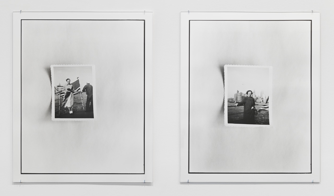 For more than a decade, Leonard’s mother and grandmother remained stateless: we see the pair in locations identified by the works’ titles: Warsaw 1943, DP Camp (shorthand for “displaced persons”), London, Italy 1946, and, in one untitled picture, on a sidewalk in the kind of in-between, nondescript landscape that has preoccupied Leonard’s camera for years. (The third floor of the gallery is devoted to Leonard’s new series documenting flocks of pigeons in flight, at once banal and sublime.) The United States was the women’s final destination. When New York Harbor appears, it is behind a windblown American flag, in one instance, and with the Statue of Liberty in the distance, in another. (In one of those beautiful accidents to be filed under “truth, stranger than fiction,” Leonard was born in a New York village named Liberty.) We never learn the artist’s grandmother’s name in the show, but her mother, Misia, is occasionally identified. In a group of five pigment prints, titled Crossing the Equator, Misia gazes into a camera’s viewfinder, just as her own daughter would, decades later.